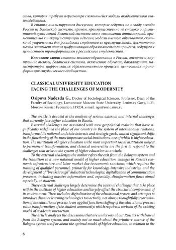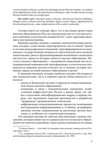 Внешние вызовы связаны с новыми геополитическими реалиями, которые существенно переопределили место нашей страны в системе международных отношений, трансформировали её национально-государственные интересы и стратегические цели, вызвали значительные сдвиги в функционировании важнейших социальных институтов, одним из которых является высшее образование. Институт высшего образования – важнейший социальный институт, подверженный перманентной трансформации, а классические университеты – первыми должны отвечать на те вызовы, которые возникают перед системой высшего образования в целом.