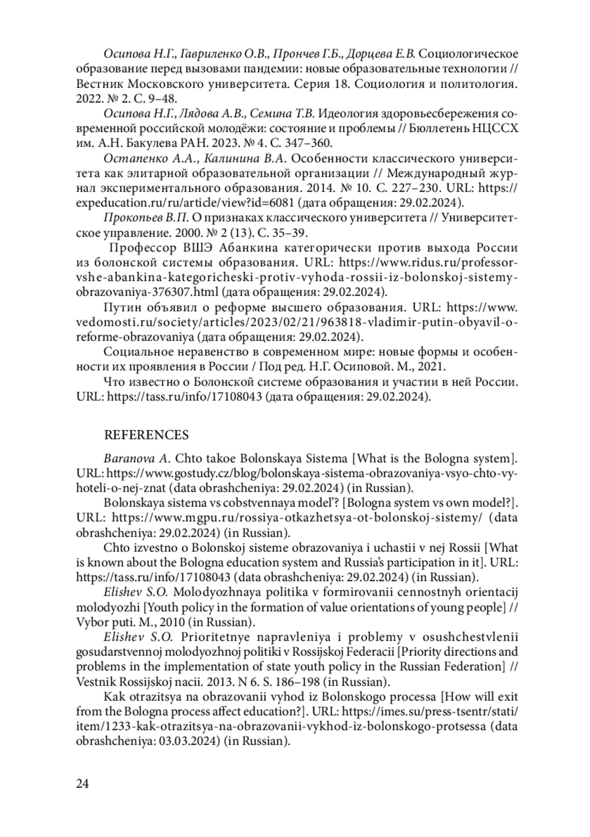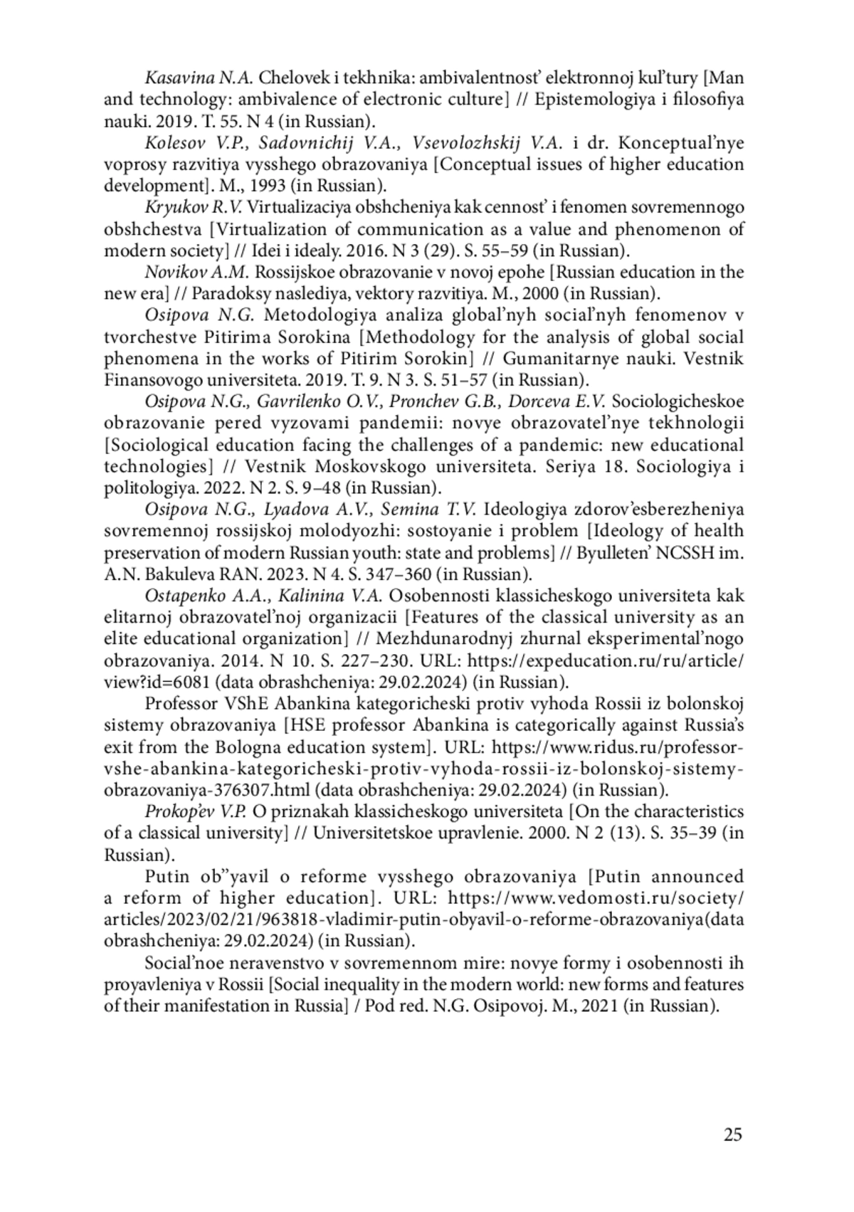 10. Осипова Н.Г., Гавриленко О.В., Прончев Г.Б., Дорцева Е.В. Социологическое образование перед вызовами пандемии: новые образовательные техноло-гии. Вестник Московского университета. Серия 18. Cоциология и полито-логия. 2022. № 2. С. 9-48.