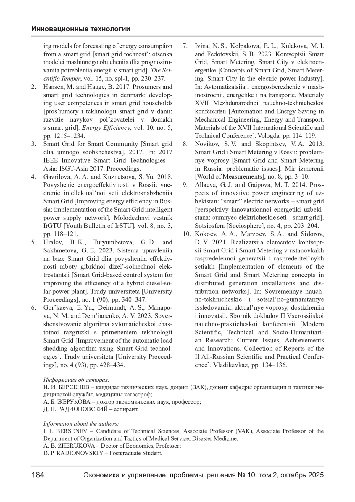 7. Ивина Н. С., Колпакова Е. Л., Кулакова М. И., Федотовский С. Б. Концепции Smart Grid, Smart Metering, Smart City в электроэнергетике // Автоматизация и энергосбережение в машиностроении, энергетике и на транспорте: материалы XVII Международной научно-технической конференции, Вологда, 2023. С. 114-119. EDN: QNYUYD