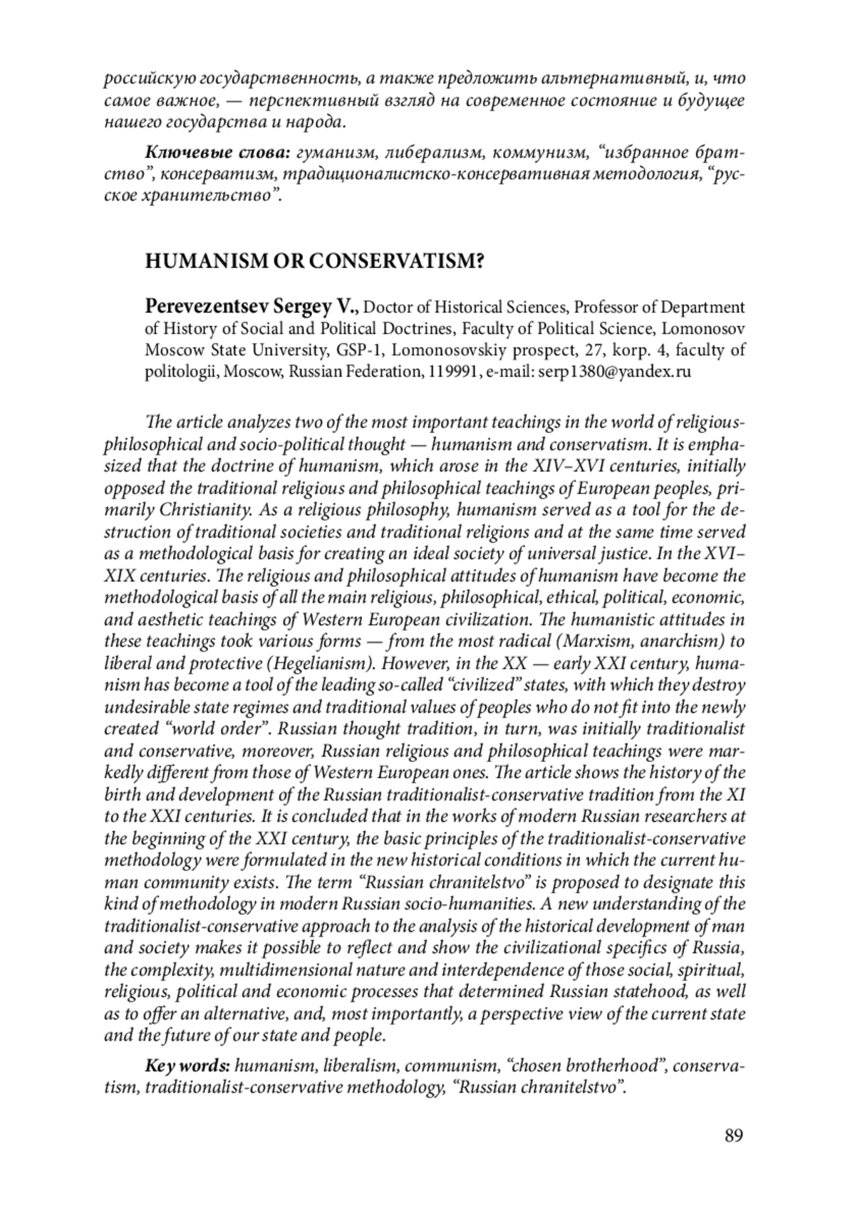 В статье проведен анализ двух важнейших учений в мировой религиозно-философской и общественно-политической мысли — гуманизма и консерватизма. Подчеркивается, что учение гуманизма, возникшее в XIV–XVI вв. изначально противостояло традиционным религиозно-философским учениям европейских народов, прежде всего христианству. Как религиозная философия, гуманизма служил орудием разрушения традиционных обществ и традиционных религий и одновременно выполнял роль методологической основы создания идеального общества всеобщей справедливости. В XVI–XIX вв. религиозно-философские установки гуманизма стали методологической базой всех основных религиозных, философских, этических, политических, экономических, эстетических учений западноевропейской цивилизации. Гуманистические установки в этих учениях принимали разные формы — от самых радикальных (марксизм, анархизм) до либеральных и охранительных (гегельянство). Однако в XX — начале XXI в. гуманизм превратился в орудие ведущих, так называемых, “цивилизованных” государств, с помощью которого они разрушают неугодные для себя государственный режимы и традиционные ценности народов, не вписывающихся во вновь создаваемый “мировой порядок”. В свою очередь, русская мыслительная традиция изначально была традиционалистской и консервативной, более того, русские религиозно-философские учения заметно отличались от учений западноевропейских. В статье показана история рождения и развития русской традиционалистско-консервативной традиции с XI по XXI вв. Делается вывод о том, что в работах современных отечественных исследователей в начале XXI в. были сформулированы основные принципы традиционалистско-консервативной методологии в новых исторических условиях, в которых существует нынешнее человеческое сообщество. Для обозначения подобного рода методологии в современной отечественной социо-гуманитарных науках предложен термин “русское хранительство”. Новое понимание традиционалистско-консервативного подхода к анализу исторического развития человека и общества позволяет отразить и показать цивилизационную специфику России, сложность, многоаспектность и взаимозависимость тех социальных, духовных, религиозных, политических и экономических процессов, которые обусловили российскую государственность, а также предложить альтернативный, и, что самое важное, — перспективный взгляд на современное состояние и будущее нашего государства и народа.