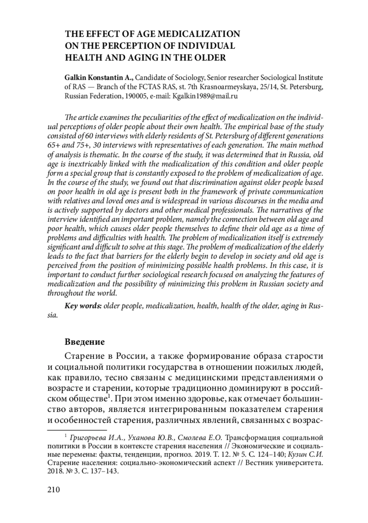 В статье рассматриваются особенности влияния медикализации на индивидуальные представления пожилых людей о своем собственном здоровье. Эмпирическую базу исследования составили 60 интервью с пожилыми жителями Санкт-Петербурга различных поколений 65+ и 75+ по 30 интервью с представителями каждого поколения. Основной метод анализа-тематический. В ходе исследования было определено, что в России пожилой возраст неразрывно связан с медикализацией этого состояния и пожилые люди образуют особую группу, которая постоянно подвержена проблеме медикализации возраста. В ходе исследования нами выяснено, что дискриминация пожилых людей исходя из плохого здоровья в пожилом возрасте присутствует, как в рамках приватного общения с родственниками и близкими так и распространенна в различных дискурсах в СМИ и активно поддерживается врачами и другими медицинскими работниками. Нарративы интервью обозначили важную проблему, а именно связь пожилого возраста и плохого самочувствия, что становится причиной определения своего пожилого возраста самим пожилыми людьми как времени проблем и сложностей со здоровьем. Сама проблема медикализации крайне значима и труднорешаема на данном этапе. Проблема медикализации пожилого возраста приводит к тому, что в обществе начинает развиваться барьеры для пожилых людей и пожилой возраст воспринимается с позиции минимизации возможных проблем, связанных со здоровьем. Значимым в данном случае выступает проведение дальнейших социологических исследований ориентированных на анализ особенностей медикализации и возможности минимизации данной проблемы в российском обществе и повсеместно в мире.