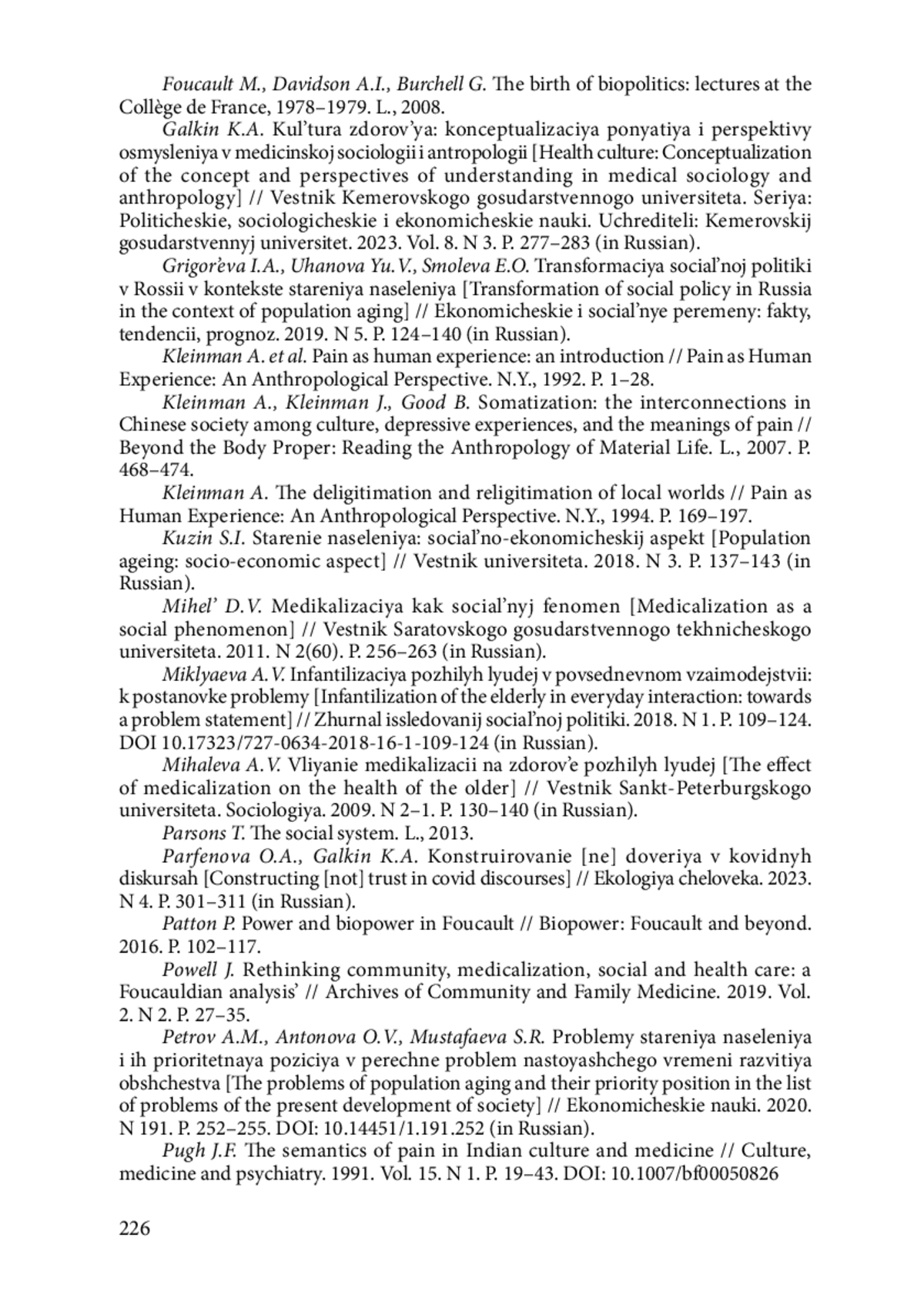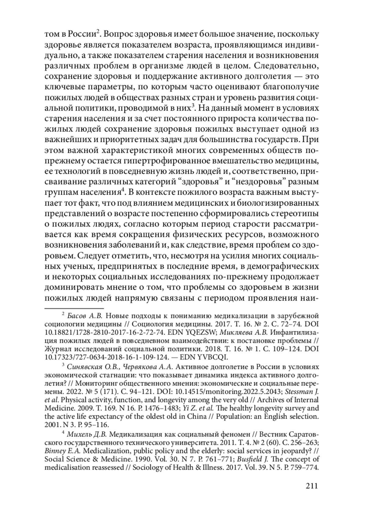 6. Михалева А.В. Влияние медикализации на здоровье пожилых людей // Вестник Санкт-Петербургского университета. Социология. 2009. №. 2-1. С. 130-140.
