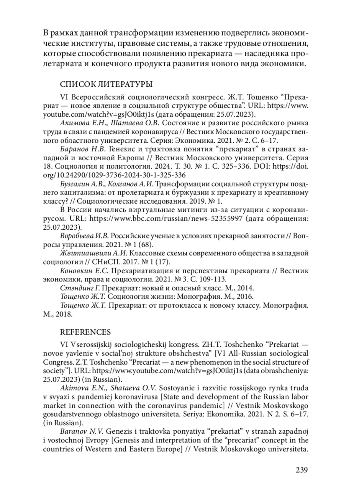 1. VI Всероссийский социологический конгресс. Ж.Т. Тощенко “Прекариат - новое явление в социальной структуре общества”. URL: https://www.youtube.com/watch?v=gsJO0iktj1s (Дата обращения: 25.07.2023).