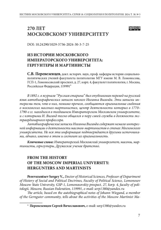 В 1892 г. в журнале “Русская старина” был опубликован перевод на русский язык автобиографических записок некоего Иоганна Виганда. Эти записки интересны тем, что в них, помимо прочего, сообщаются оригинальные сведения о московских масонах-мартинистах, центр деятельности которых в 1770–1790-е гг. находился в тогдашнем Императорском Московском университете, и с которыми И. Виганд тесно общался в пору своей службы в должности экстраординарного профессора.
