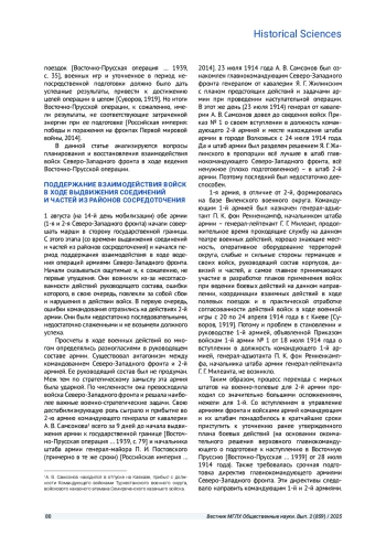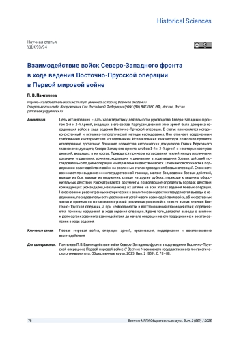 Цель исследования - дать характеристику деятельности руководства Северо-Западным фронтом 1-й и 2-й Армий, входящих в его состав. Корпусам дивизий этих армий была доверена координация войск в ходе ведения Восточно-Прусской операции. В статье применяются историко-системный и историко-типологический методы исследования. Они отвечают современным требованиям к историческим исследованиям. Использование этих методов позволило провести исследование достаточно большого количества исторических документов Ставки Верховного главнокомандующего, Северо-Западного фронта, штабов 1-й и 2-й армий и некоторых корпусов дивизий, входящих в их состав. Приводятся примеры согласования усилий между различными органами управления, армиями, корпусами и дивизиями в ходе ведения боевых действий последовательно по дням операции и направлениям действий войск. Отмечаются сложности в поддержании взаимодействия войск на различных этапах проведения боевых операций. Сложности возникают при выдвижении к государственной границе, завязке боя, ведении боевых действий, выходе из боя, выходе из окружения, отходе на другие рубежи, переходе к ведению оборонительных действий. Рассматриваются документы, позволяющие определить порядок действий командующих (командиров, начальников), их штабов на всех этапах ведения боевых операций. На основании рассмотренных исторических и аналитических документов делаются выводы о содержании, последовательности достижения устойчивого взаимодействия войск, об их составных частях и приемах по согласованию усилий различных родов войск на всех этапах ведения Восточно-Прусской операции, а при необходимости и восстановления взаимодействия; определяются причины нарушений в ходе ведения операции. Кроме того, делаются выводы о влиянии и роли организованного взаимодействия до начала операции на его поддержание и восстановление в ходе ведения.