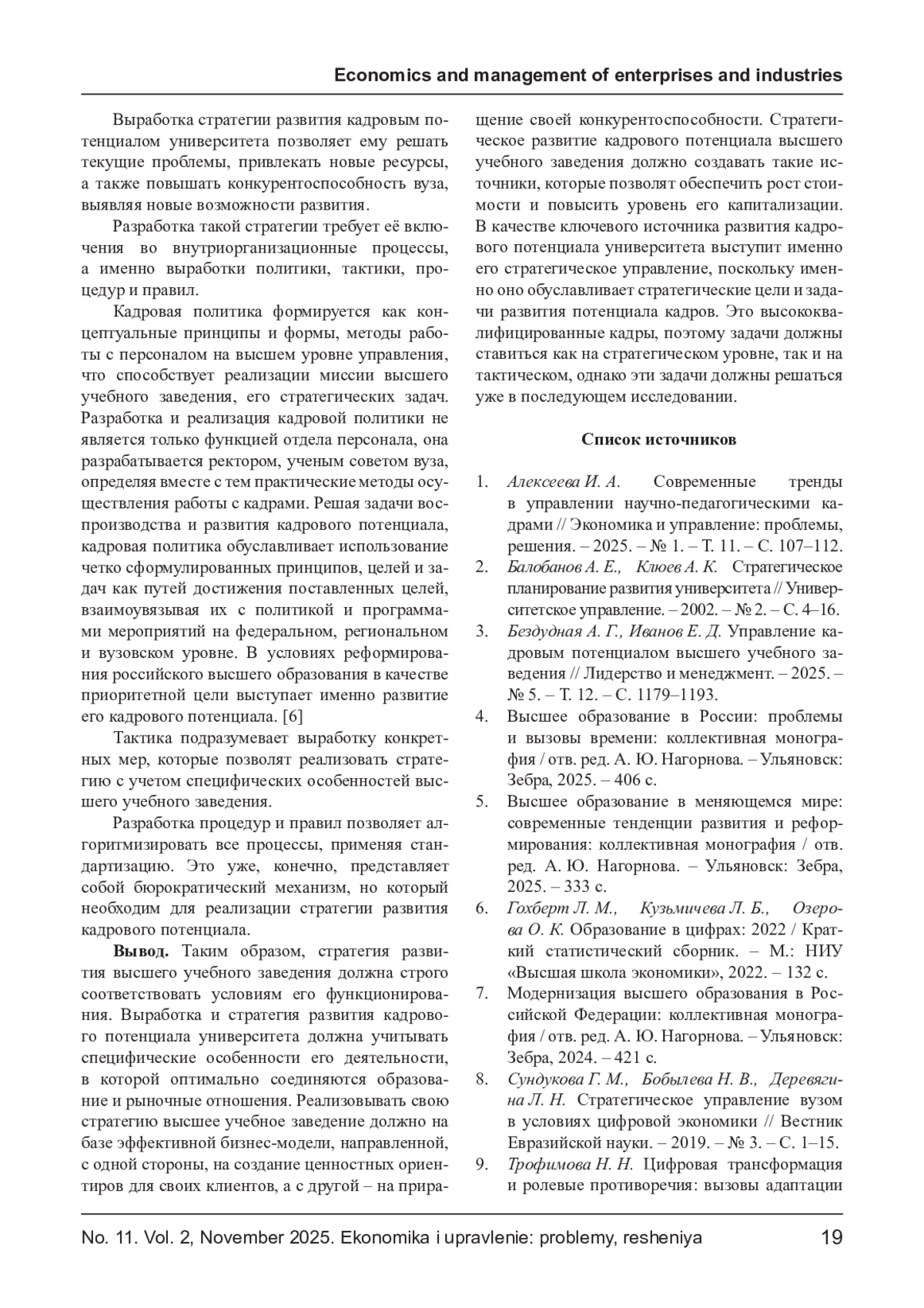 1. Алексеева И. А. Современные тренды в управлении научно-педагогическими кадрами // Экономика и управление: проблемы, решения. - 2025. - № 1. - Т. 11. - С. 107-112. EDN: CICBPW