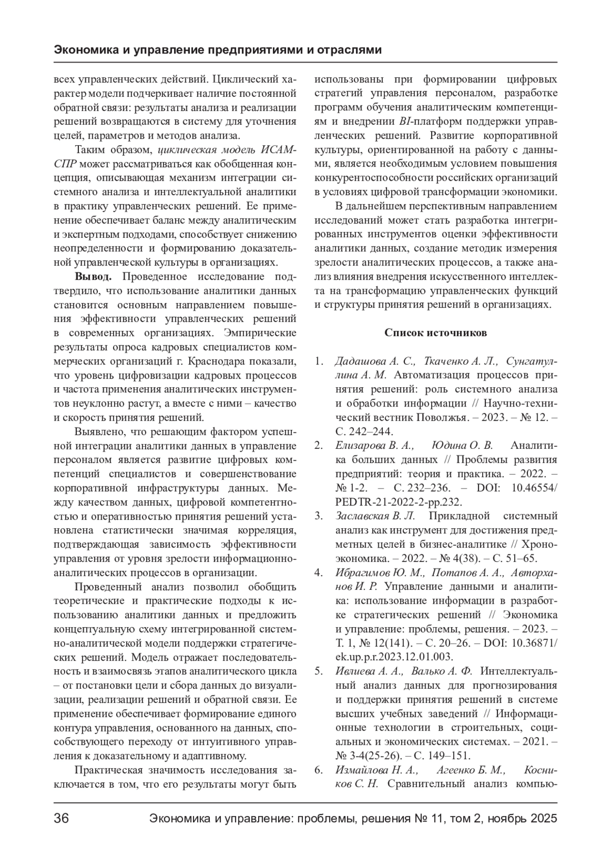 В статье рассматриваются теоретические и практические вопросы применения аналитики данных в процессе принятия управленческих решений. Актуальность темы обусловлена цифровой трансформацией экономики, в рамках которой данные являются главным ресурсом организаций. Проведен анализ научных подходов к использованию системного анализа, интеллектуальной и бизнес-аналитики как инструментов повышения эффективности управления. Эмпирическая часть исследования основана на результатах опроса кадровых специалистов коммерческих организаций города Краснодара, направленного на выявление степени цифровизации кадровых процессов и роли аналитики данных в управлении персоналом. Установлены статистически значимые корреляции между качеством данных, уровнем цифровой компетентности и оперативностью принятия решений. На основе анализа предложено концептуальное описание интегрированной системно-аналитической модели поддержки стратегических решений, отражающей циклический характер управленческого процесса - от постановки целей и обработки данных до визуализации, реализации решений и обратной связи. Применение данной модели способствует переходу от интуитивного управления к доказательному, повышает прозрачность, обоснованность и адаптивность управленческих решений в организациях.