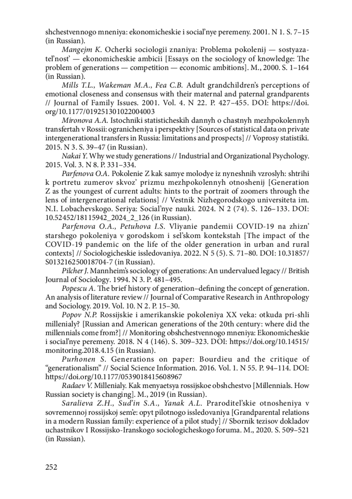 6. Парфенова О.А. Поколение Z как самые молодые из нынешних взрослых: штрихи к портрету зумеров сквозь призму межпоколенных отношений // Вестник Нижегородского университета им. Н.И. Лобачевского. Серия: Социальные науки. 2024. № 2 (74). С. 126-133. https://doi.org/10.52452/18115942_2024_2_126.