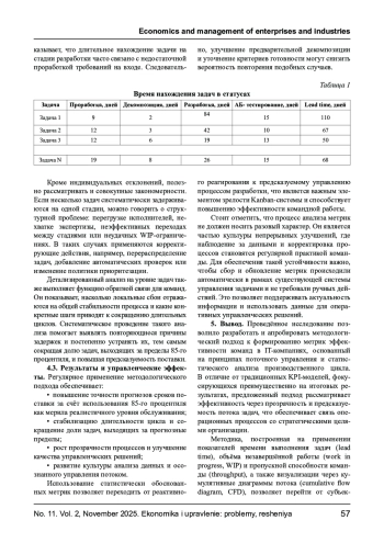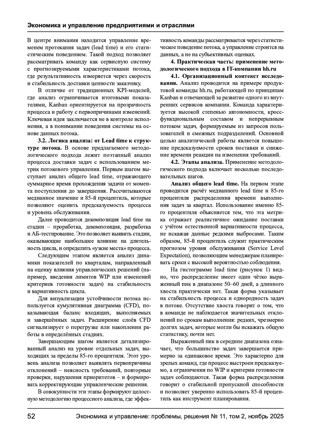 Статья посвящена разработке методологического подхода к формированию системы метрик эффективности команд в IT-компаниях. В работе рассматриваются существующие модели оценки результативности и предлагается процессно-ориентированный подход на основе принципов Kanban и потокового управления. Основное внимание уделено анализу времени выполнения задач (lead time) и его составных частей, а также статистическим методам интерпретации этих данных как основы для измерения и прогнозирования командной эффективности. На примере команды hh. ru показаны возможные способы применения предложенных метрик для повышения прозрачности процессов и принятия обоснованных управленческих решений.