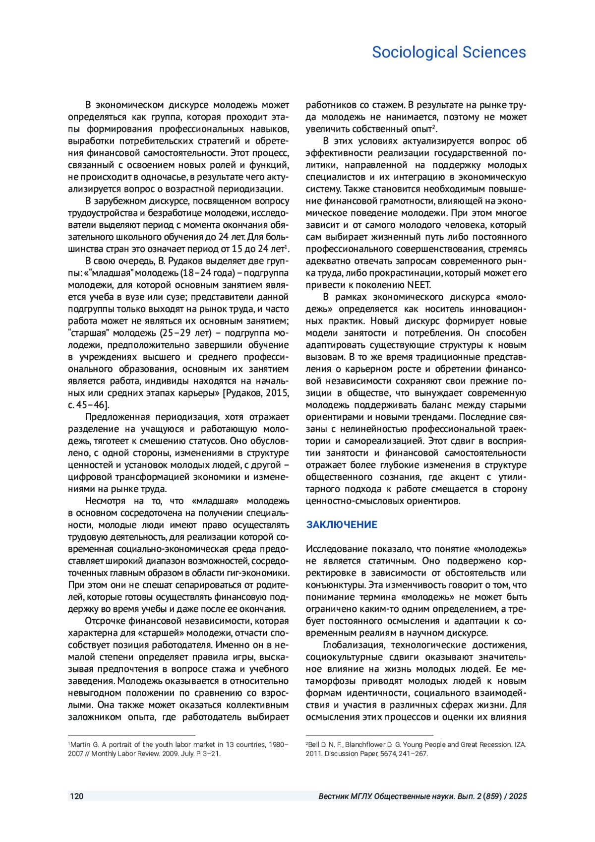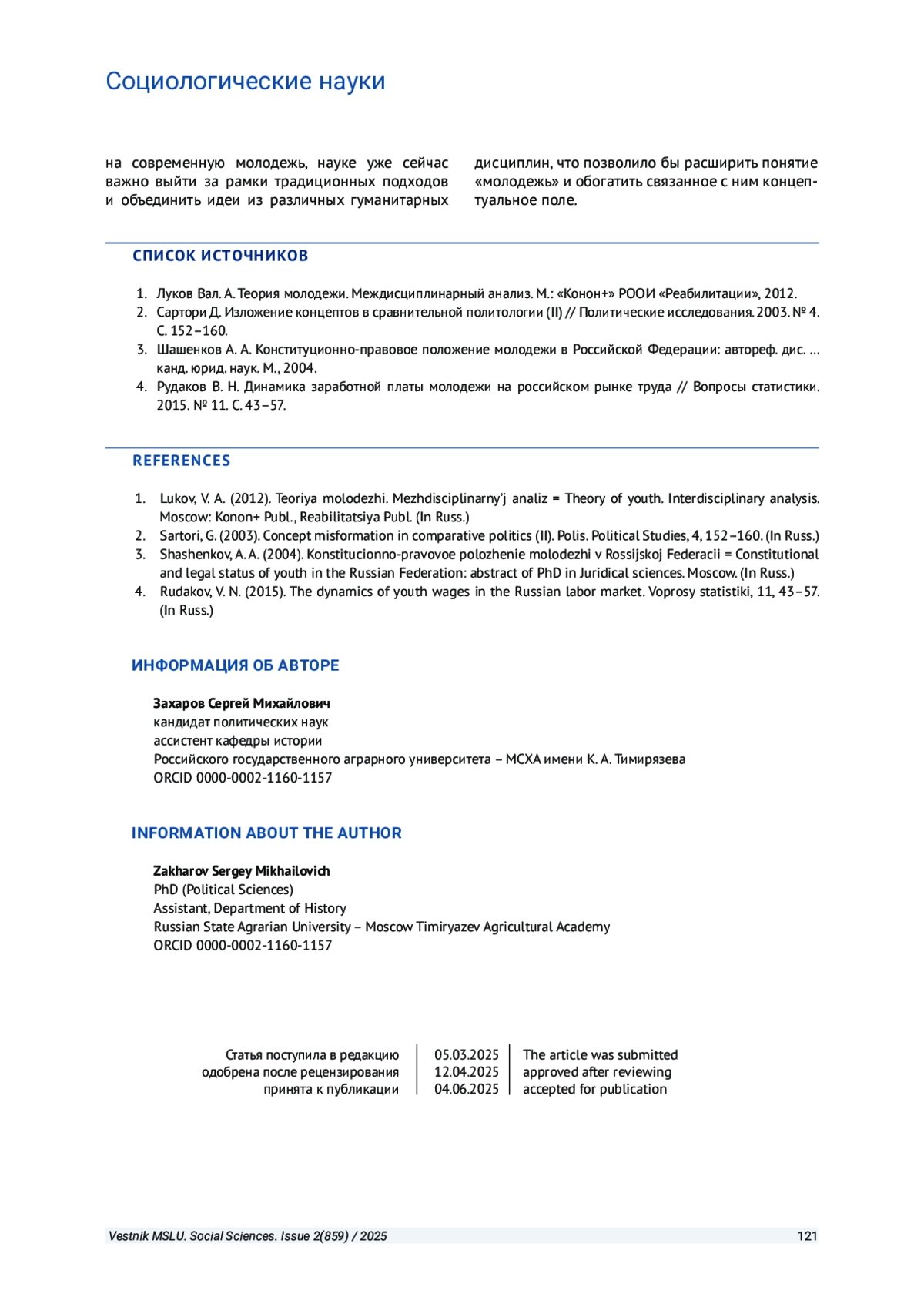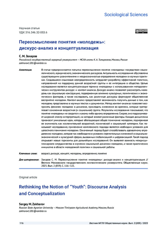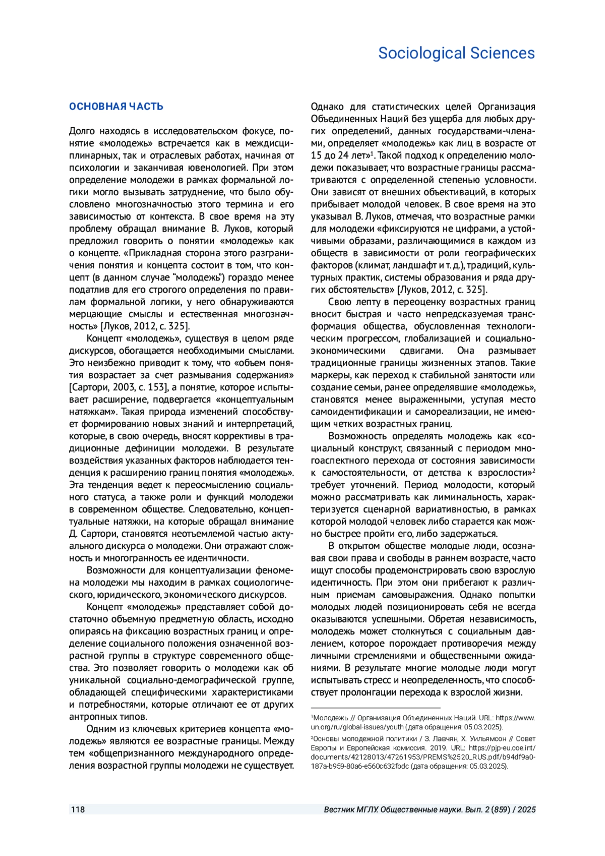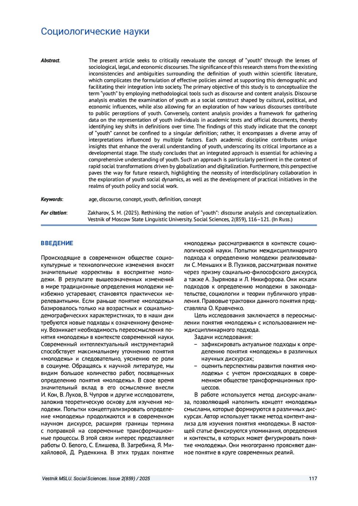 ЗАХАРОВ С. М. ПЕРЕОСМЫСЛЕНИЕ ПОНЯТИЯ «МОЛОДЕЖЬ»: ДИСКУРС-АНАЛИЗ И КОНЦЕПТУАЛИЗАЦИЯ // ВЕСТНИК МОСКОВСКОГО ГОСУДАРСТВЕННОГО ЛИНГВИСТИЧЕСКОГО УНИВЕРСИТЕТА. ОБЩЕСТВЕННЫЕ НАУКИ. 2025. № 2 (859)
