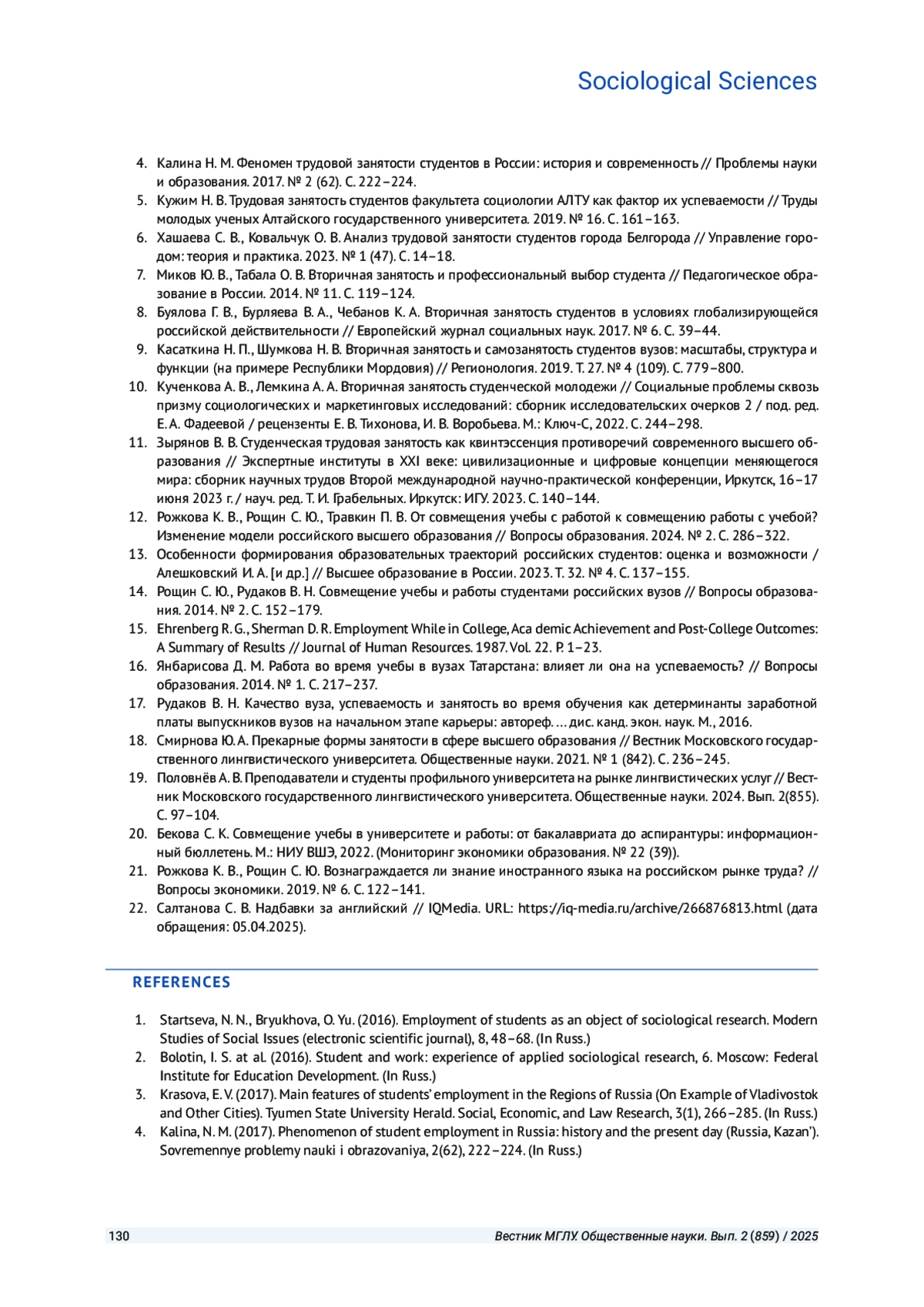 1. Старцева Н. Н., Брюхова О. Ю. Трудовая занятость студентов как объект социологического исследования // Современные исследования социальных проблем (электронный научный журнал). 2016. № 8. С. 48-68. EDN: WVJLLP