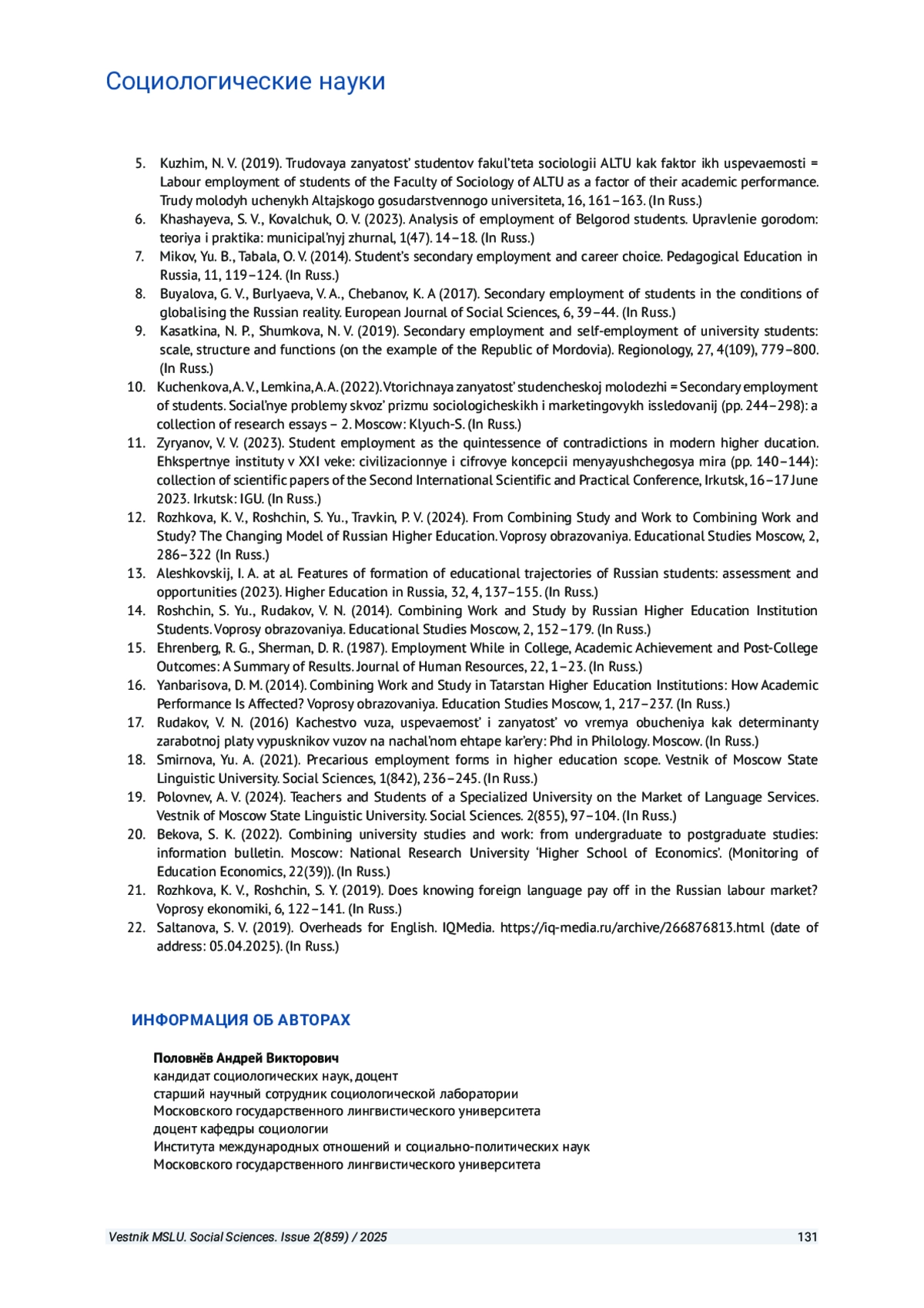 19. Половнёв А. В. Преподаватели и студенты профильного университета на рынке лингвистических услуг // Вестник Московского государственного лингвистического университета. Общественные науки. 2024. Вып. 2(855). С. 97-104. EDN: WQNBDC