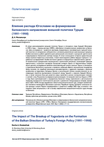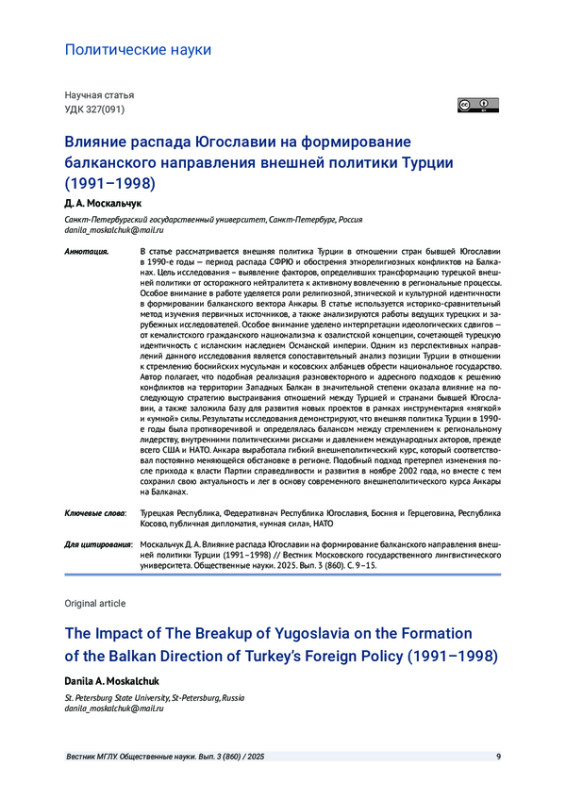 В статье рассматривается внешняя политика Турции в отношении стран бывшей Югославии в 1990-е годы - период распада СФРЮ и обострения этнорелигиозных конфликтов на Балканах. Цель исследования - выявление факторов, определивших трансформацию турецкой внешней политики от осторожного нейтралитета к активному вовлечению в региональные процессы. Особое внимание в работе уделяется роли религиозной, этнической и культурной идентичности в формировании балканского вектора Анкары. В статье используется историко-сравнительный метод изучения первичных источников, а также анализируются работы ведущих турецких и зарубежных исследователей. Особое внимание уделено интерпретации идеологических сдвигов - от кемалистского гражданского национализма к озалистской концепции, сочетающей турецкую идентичность с исламским наследием Османской империи. Одним из перспективных направлений данного исследования является сопоставительный анализ позиции Турции в отношении к стремлению боснийских мусульман и косовских албанцев обрести национальное государство. Автор полагает, что подобная реализация разновекторного и адресного подходов к решению конфликтов на территории Западных Балкан в значительной степени оказала влияние на последующую стратегию выстраивания отношений между Турцией и странами бывшей Югославии, а также заложила базу для развития новых проектов в рамках инструментария «мягкой» и «умной» силы. Результаты исследования демонстрируют, что внешняя политика Турции в 1990-е годы была противоречивой и определялась балансом между стремлением к региональному лидерству, внутренними политическими рисками и давлением международных акторов, прежде всего США и НАТО. Анкара выработала гибкий внешнеполитический курс, который соответствовал постоянно меняющейся обстановке в регионе. Подобный подход претерпел изменения после прихода к власти Партии справедливости и развития в ноябре 2002 года, но вместе с тем сохранил свою актуальность и лег в основу современного внешнеполитического курса Анкары на Балканах.
