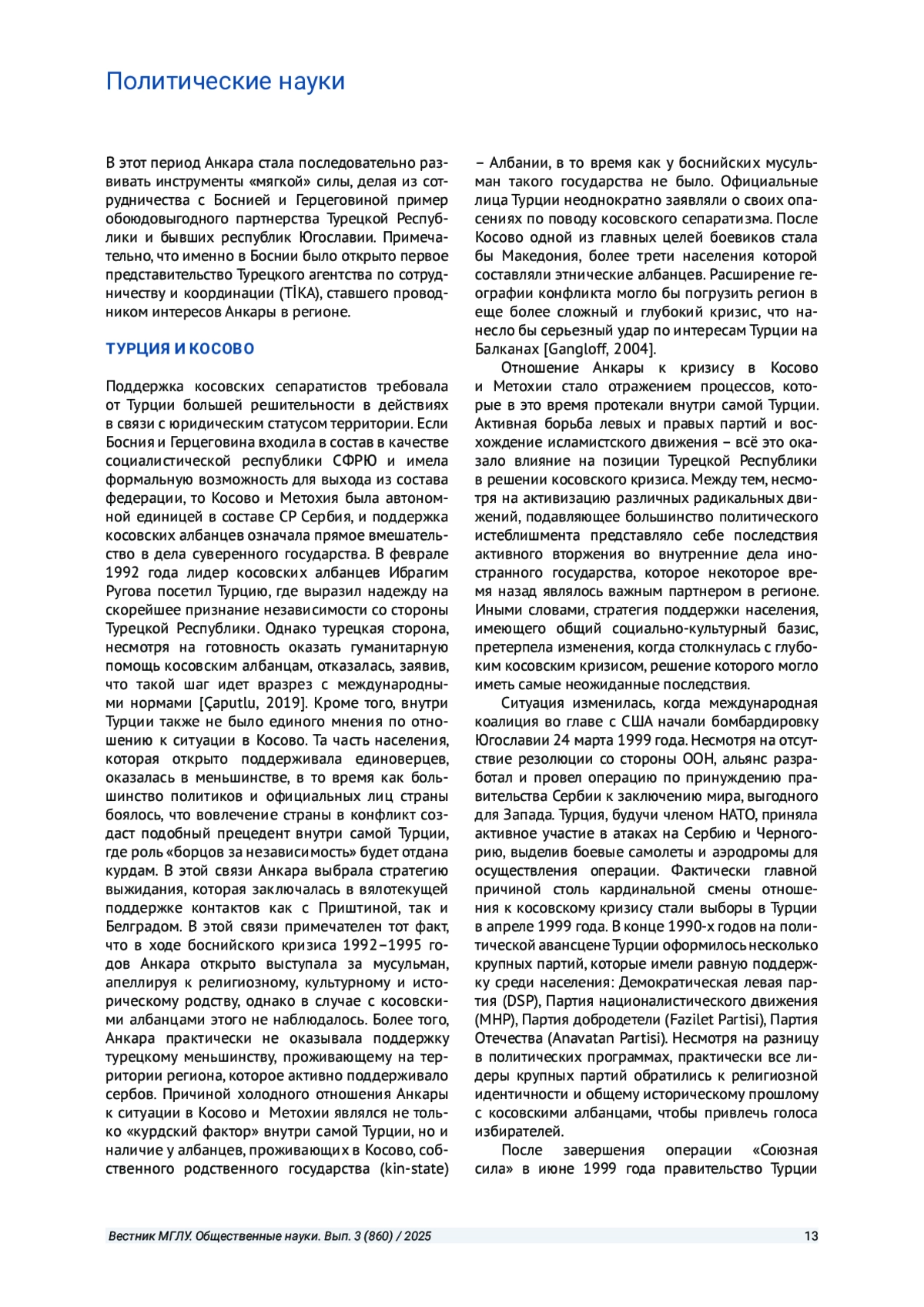 6. Çaputlu Ö. Karşılaştırmalı bir İnceleme: Türkiye’nin 1990’lı yıllarda Bosna-Hersek ve Kosova krizlerine yönelik dış politikası // Barış Araştırmaları ve Çatışma Çözümleri Dergisi. 2019. Vol. 7(2). P. 49-78.