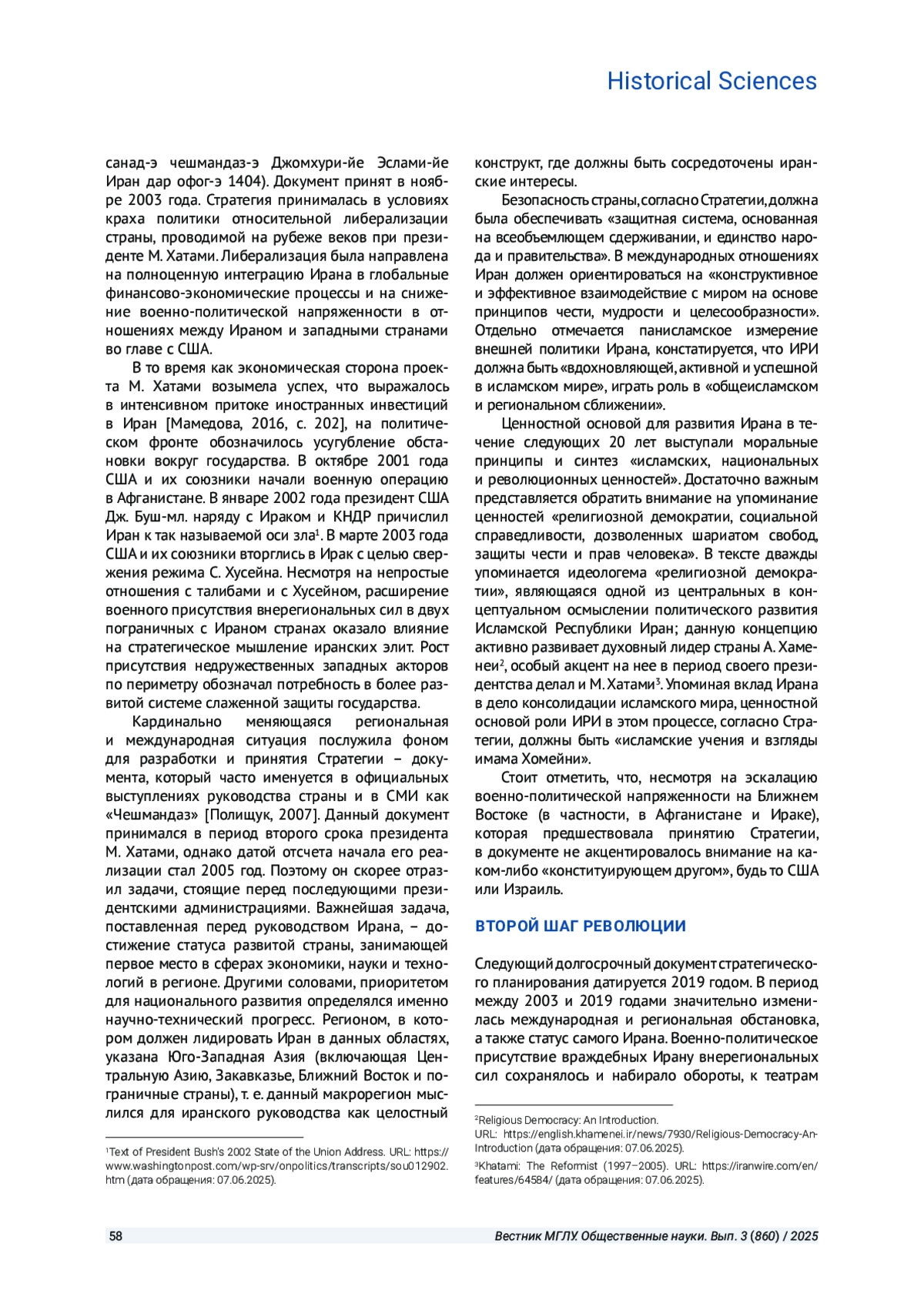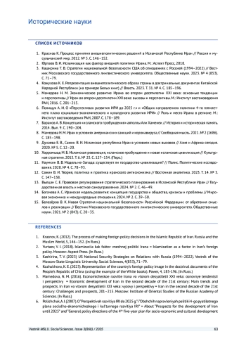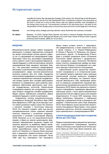 Статья: ВНЕШНЕПОЛИТИЧЕСКИЕ ИНТЕРЕСЫ И ЦЕННОСТИ ИСЛАМСКОЙ РЕСПУБЛИКИ ИРАН В НАЦИОНАЛЬНЫХ ДОКУМЕНТАХ СТРАТЕГИЧЕСКОГО ПЛАНИРОВАНИЯ: РЕТРОСПЕКТИВА И СОВРЕМЕННОСТЬ (2025)