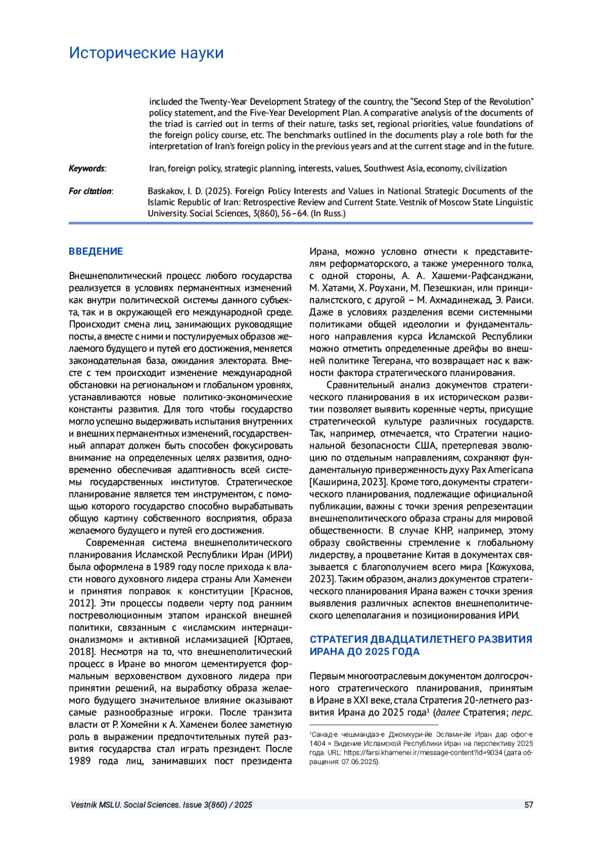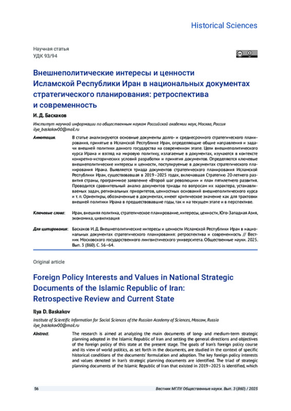 БАСКАКОВ И. Д. ВНЕШНЕПОЛИТИЧЕСКИЕ ИНТЕРЕСЫ И ЦЕННОСТИ ИСЛАМСКОЙ РЕСПУБЛИКИ ИРАН В НАЦИОНАЛЬНЫХ ДОКУМЕНТАХ СТРАТЕГИЧЕСКОГО ПЛАНИРОВАНИЯ: РЕТРОСПЕКТИВА И СОВРЕМЕННОСТЬ // ВЕСТНИК МОСКОВСКОГО ГОСУДАРСТВЕННОГО ЛИНГВИСТИЧЕСКОГО УНИВЕРСИТЕТА. ОБЩЕСТВЕННЫЕ НАУКИ. 2025. № 3 (860)