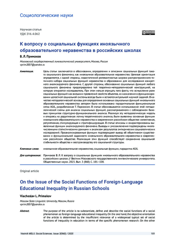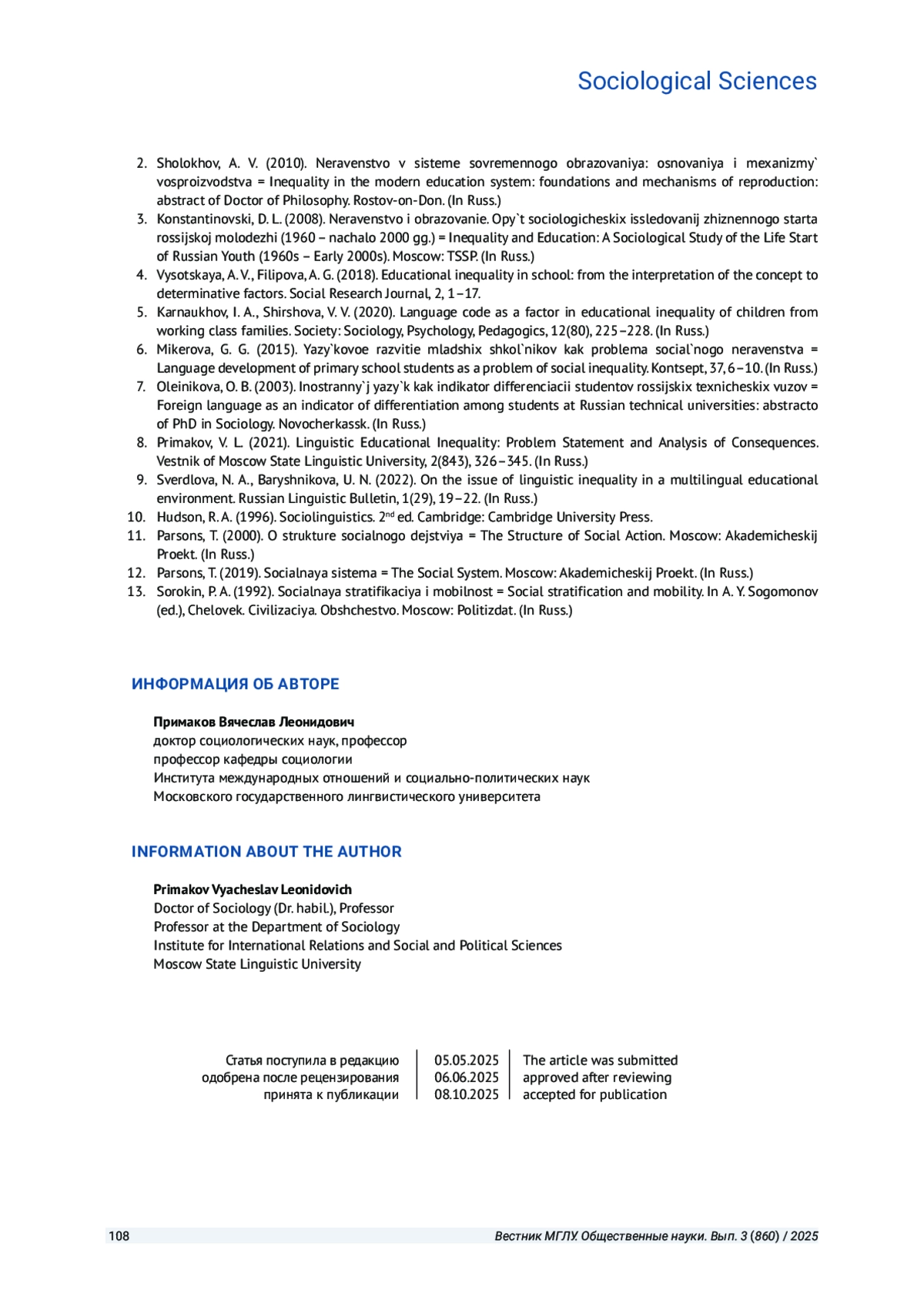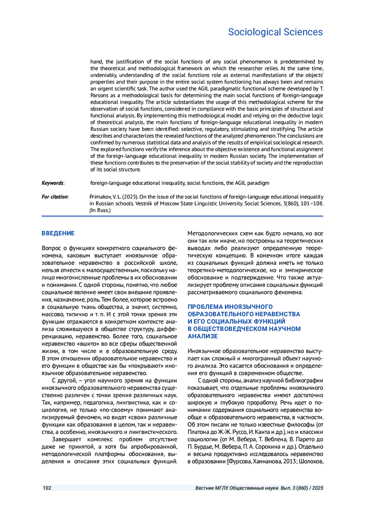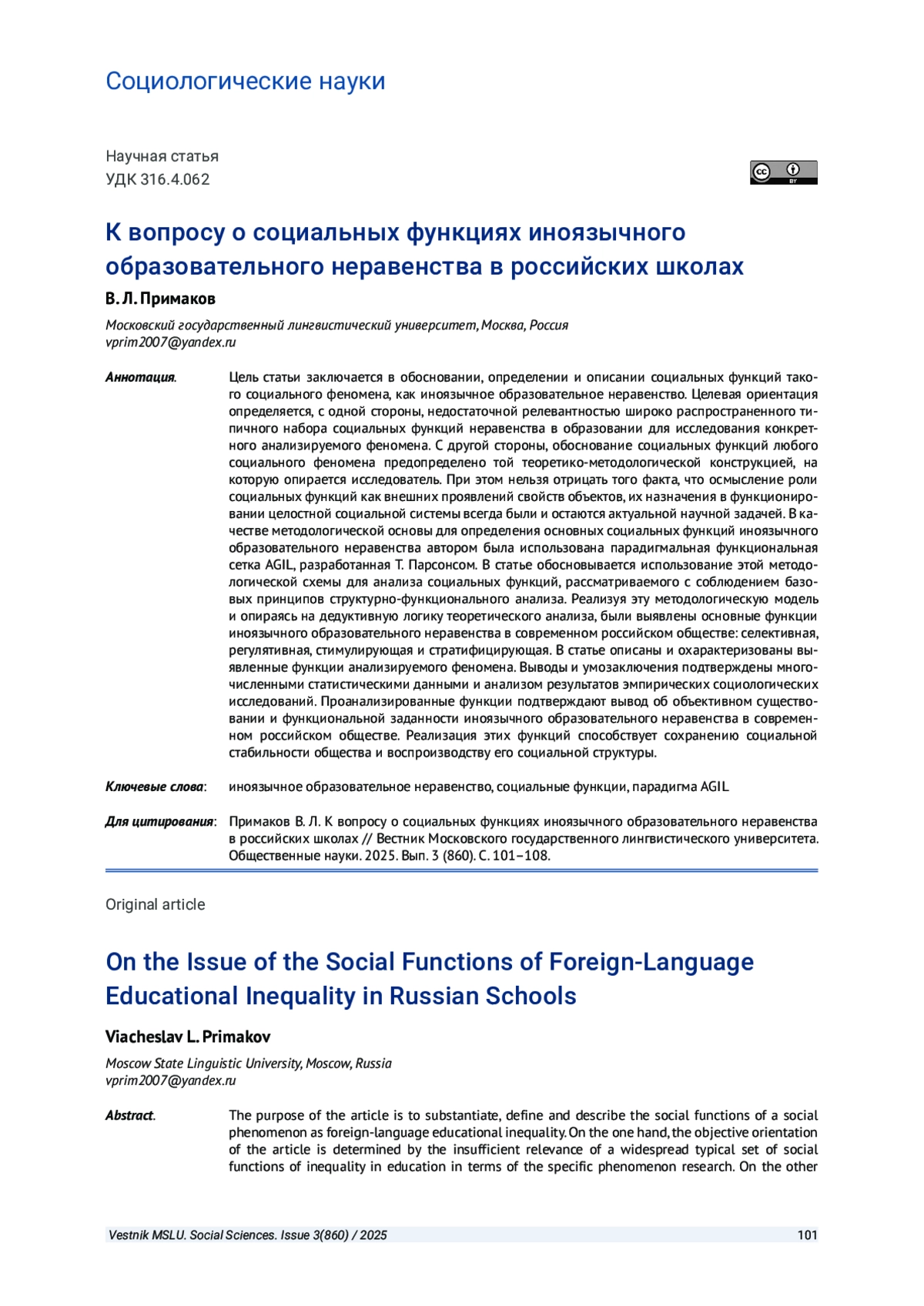 ПРИМАКОВ В. Л. К ВОПРОСУ О СОЦИАЛЬНЫХ ФУНКЦИЯХ ИНОЯЗЫЧНОГО ОБРАЗОВАТЕЛЬНОГО НЕРАВЕНСТВА В РОССИЙСКИХ ШКОЛАХ // ВЕСТНИК МОСКОВСКОГО ГОСУДАРСТВЕННОГО ЛИНГВИСТИЧЕСКОГО УНИВЕРСИТЕТА. ОБЩЕСТВЕННЫЕ НАУКИ. 2025. № 3 (860)