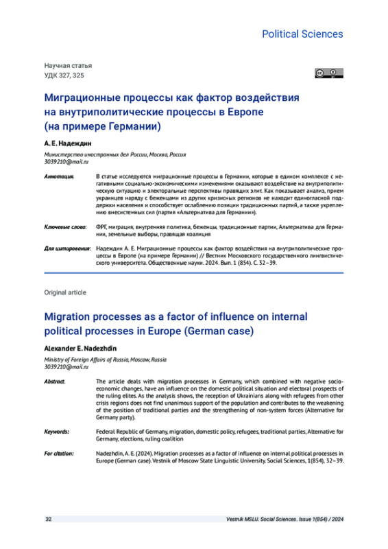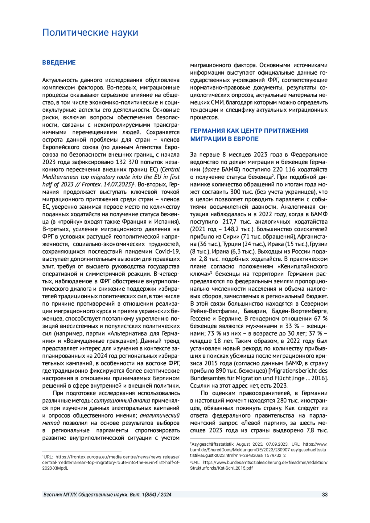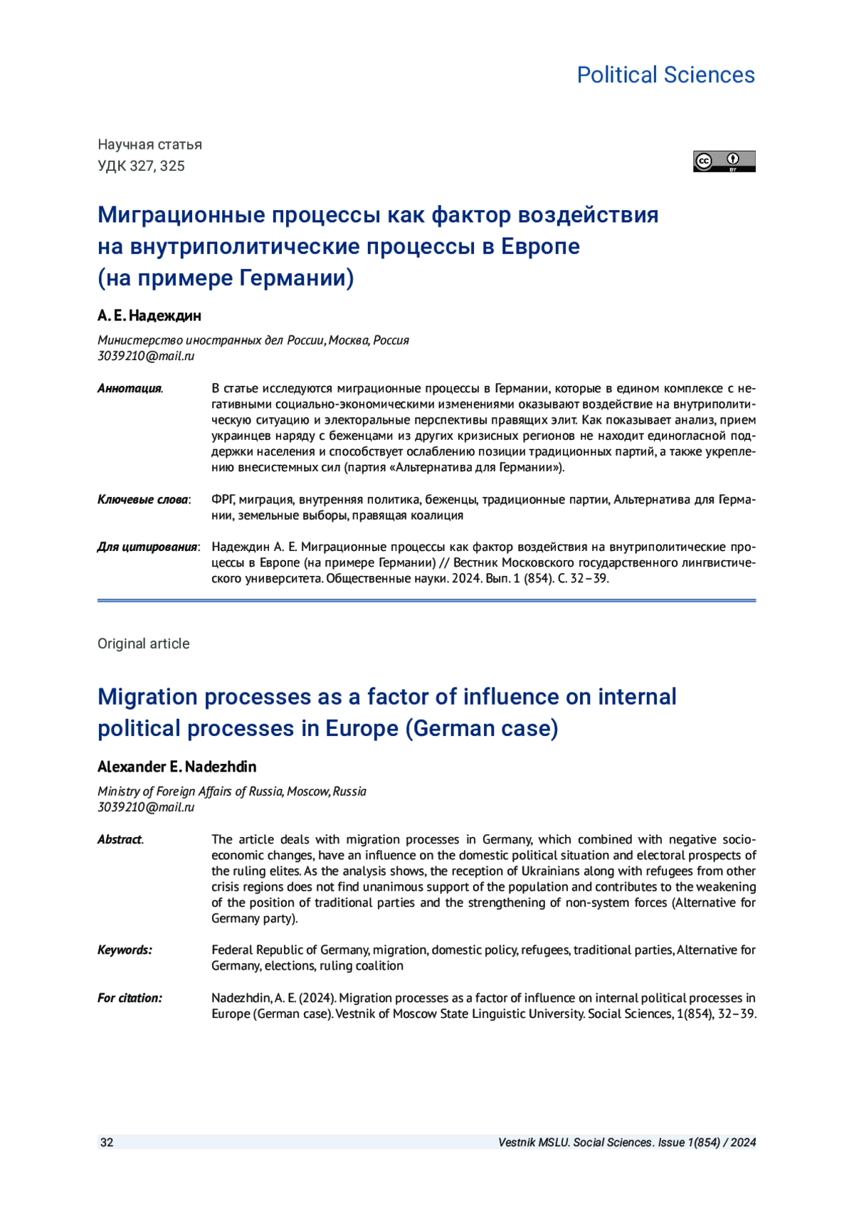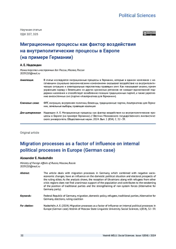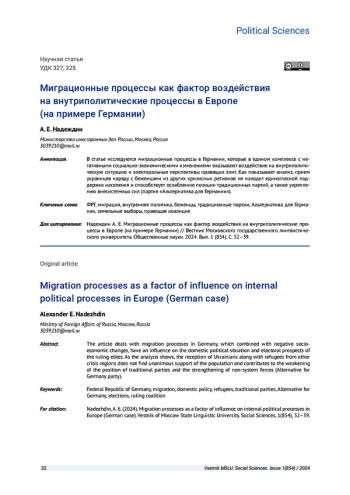 НАДЕЖДИН А. Е. МИГРАЦИОННЫЕ ПРОЦЕССЫ КАК ФАКТОР ВОЗДЕЙСТВИЯ НА ВНУТРИПОЛИТИЧЕСКИЕ ПРОЦЕССЫ В ЕВРОПЕ (НА ПРИМЕРЕ ГЕРМАНИИ) // ВЕСТНИК МОСКОВСКОГО ГОСУДАРСТВЕННОГО ЛИНГВИСТИЧЕСКОГО УНИВЕРСИТЕТА. ОБЩЕСТВЕННЫЕ НАУКИ. 2024. № 1 (854)