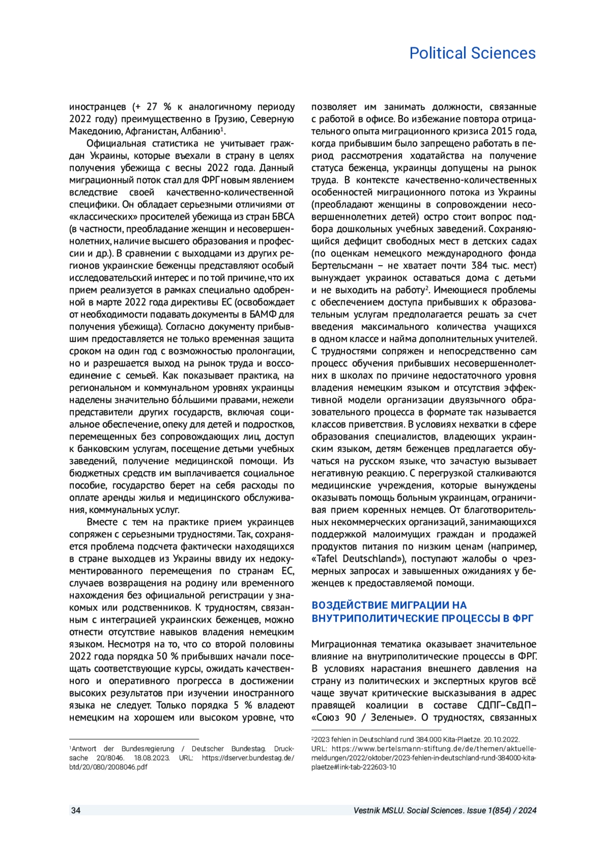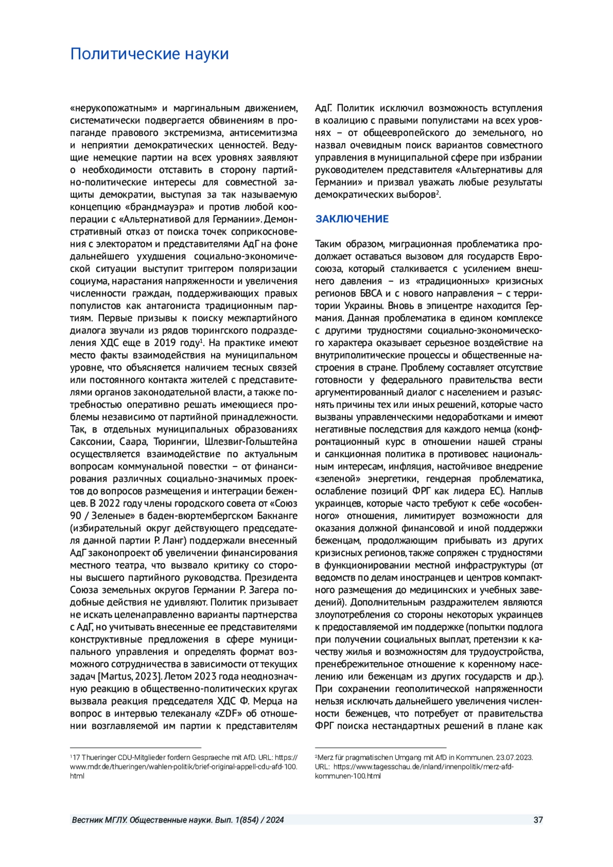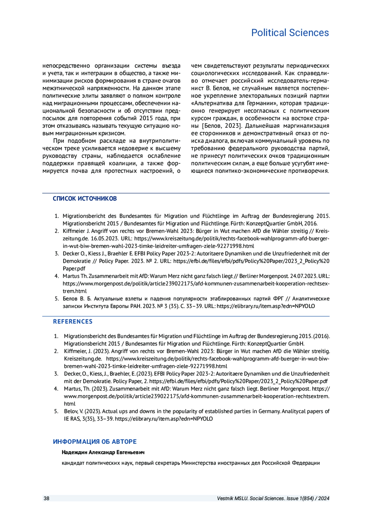 НАДЕЖДИН А. Е. МИГРАЦИОННЫЕ ПРОЦЕССЫ КАК ФАКТОР ВОЗДЕЙСТВИЯ НА ВНУТРИПОЛИТИЧЕСКИЕ ПРОЦЕССЫ В ЕВРОПЕ (НА ПРИМЕРЕ ГЕРМАНИИ) // ВЕСТНИК МОСКОВСКОГО ГОСУДАРСТВЕННОГО ЛИНГВИСТИЧЕСКОГО УНИВЕРСИТЕТА. ОБЩЕСТВЕННЫЕ НАУКИ. 2024. № 1 (854)
