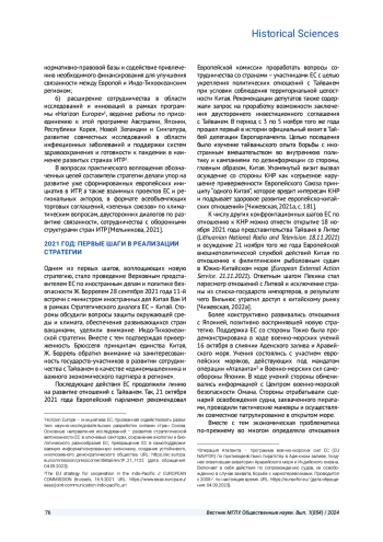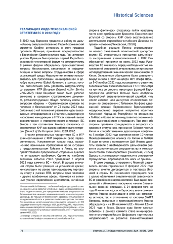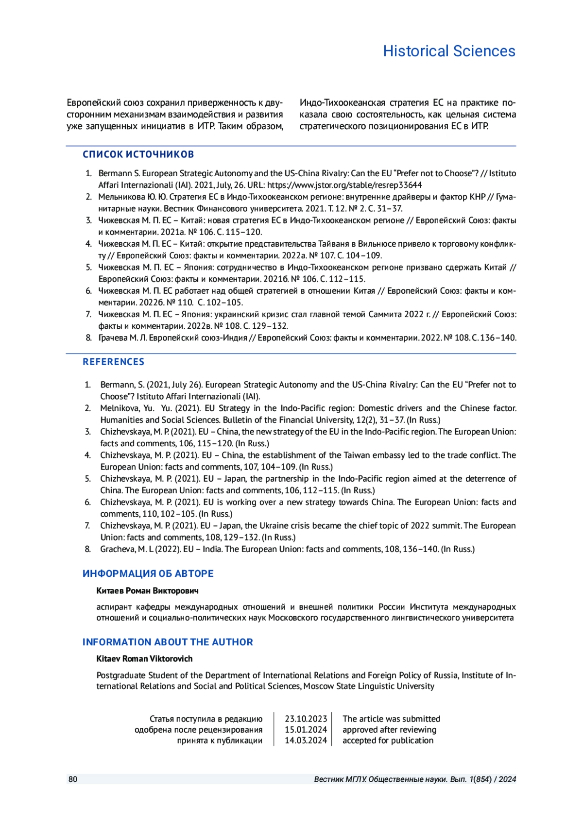 2. Мельникова Ю. Ю. Стратегия ЕС в Индо-Тихоокеанском регионе: внутренние драйверы и фактор КНР // Гуманитарные науки. Вестник Финансового университета. 2021. т. 12. № 2. С. 31-37.