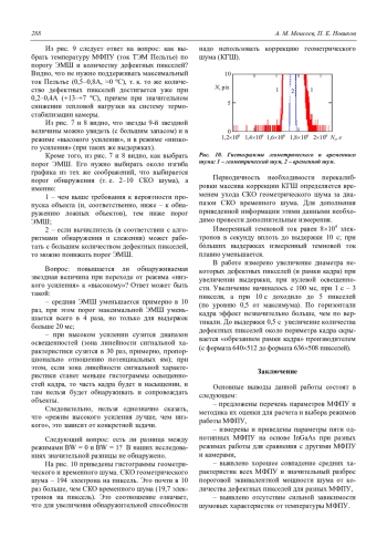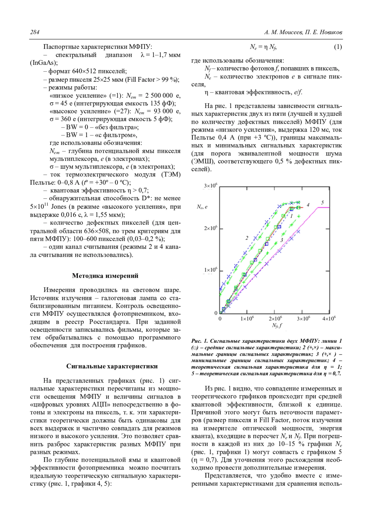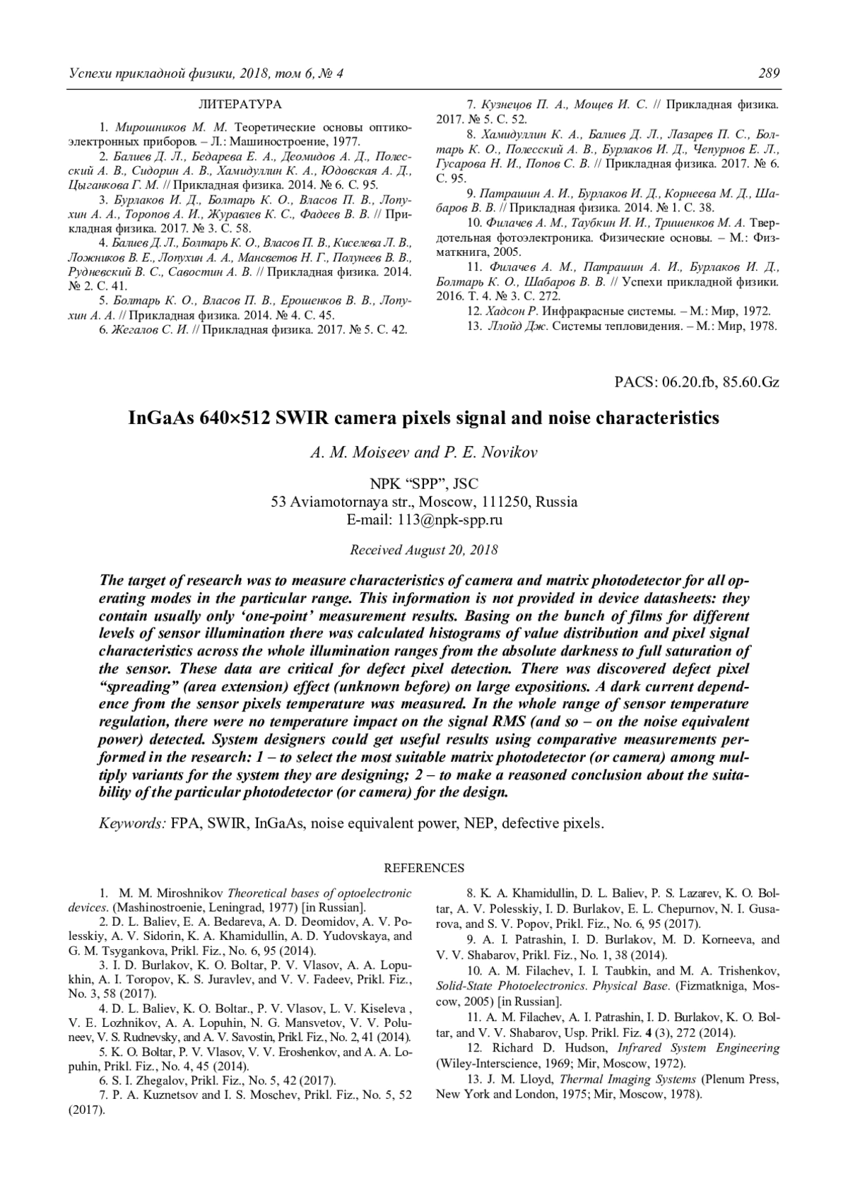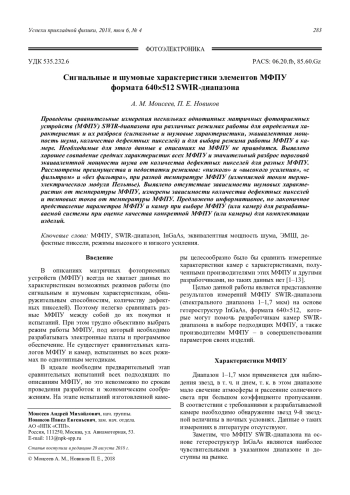 Проведены сравнительные измерения нескольких однотипных матричных фотоприемных устройств (МФПУ) SWIR-диапазона при различных режимах работы для определения характеристик и их разброса (сигнальные и шумовые характеристики, эквивалентная мощность шума, количество дефектных пикселей) и для выбора режима работы МФПУ в камере. Необходимые для этого данные в описаниях на МФПУ не приводятся. Выявлено хорошее совпадение средних характеристик всех МФПУ и значительный разброс пороговой эквивалентной мощности шума от количества дефектных пикселей для разных МФПУ. Рассмотрены преимущества и недостатки режимов: «низкого» и «высокого усиления», «с фильтром» и «без фильтра», при разной температуре МФПУ (изменяемой током термоэлектрического модуля Пельтье). Выявлено отсутствие зависимости шумовых характеристик от температуры МФПУ, измерены зависимости количества дефектных пикселей и темновых токов от температуры МФПУ. Предложено информативное, но лаконичное представление параметров МФПУ и камер при выборе МФПУ (или камер) для разрабатываемой системы при оценке качества конкретной МФПУ (или камеры) для комплектации изделий.