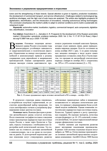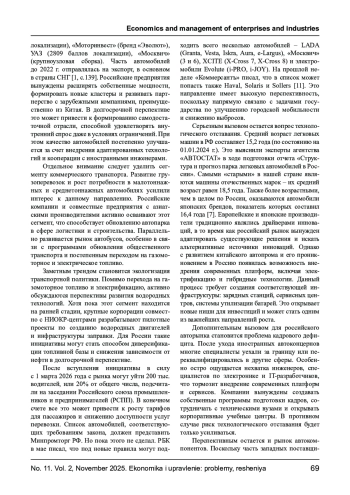 Статья посвящена анализу современных тенденций автомобильного рынка России в условиях экономических и политических ограничений. Рассмотрены изменения в структуре продаж, вызванные уходом западных производителей и усилением позиций азиатских брендов. Особое внимание уделено вопросам логистики, локализации производства, развитию сегмента коммерческого транспорта и сервисной инфраструктуры. Проанализированы вызовы, связанные с технологическим отставанием, кадровым дефицитом и высокой стоимостью автокредитования. Отдельно освещены перспективы цифровизации, электрификации и внедрения инноваций, включая беспилотные технологии. Сделан вывод о способности рынка адаптироваться к внешним условиям и формировать устойчивую модель развития.