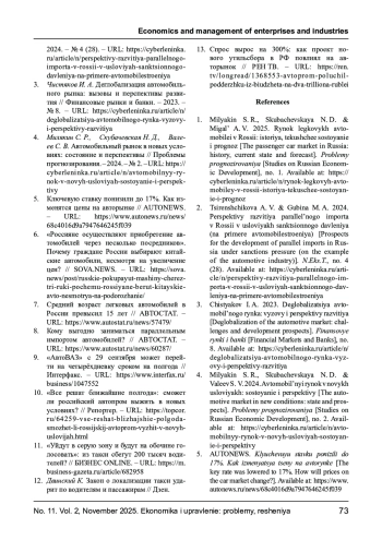 2. Циренщикова А. В., Губина М. А. Перспективы развития параллельного импорта в России в условиях санкционного давления (на примере автомобилестроения) // Н.Экс.Т. - 2024. - № 4 (28). - URL: https://cyberleninka.ru/article/n/perspektivy-razvitiya-parallelnogoimporta-v-rossii-v-usloviyah-sanktsionnogodavleniya-na-primere-avtomobilestroeniya.