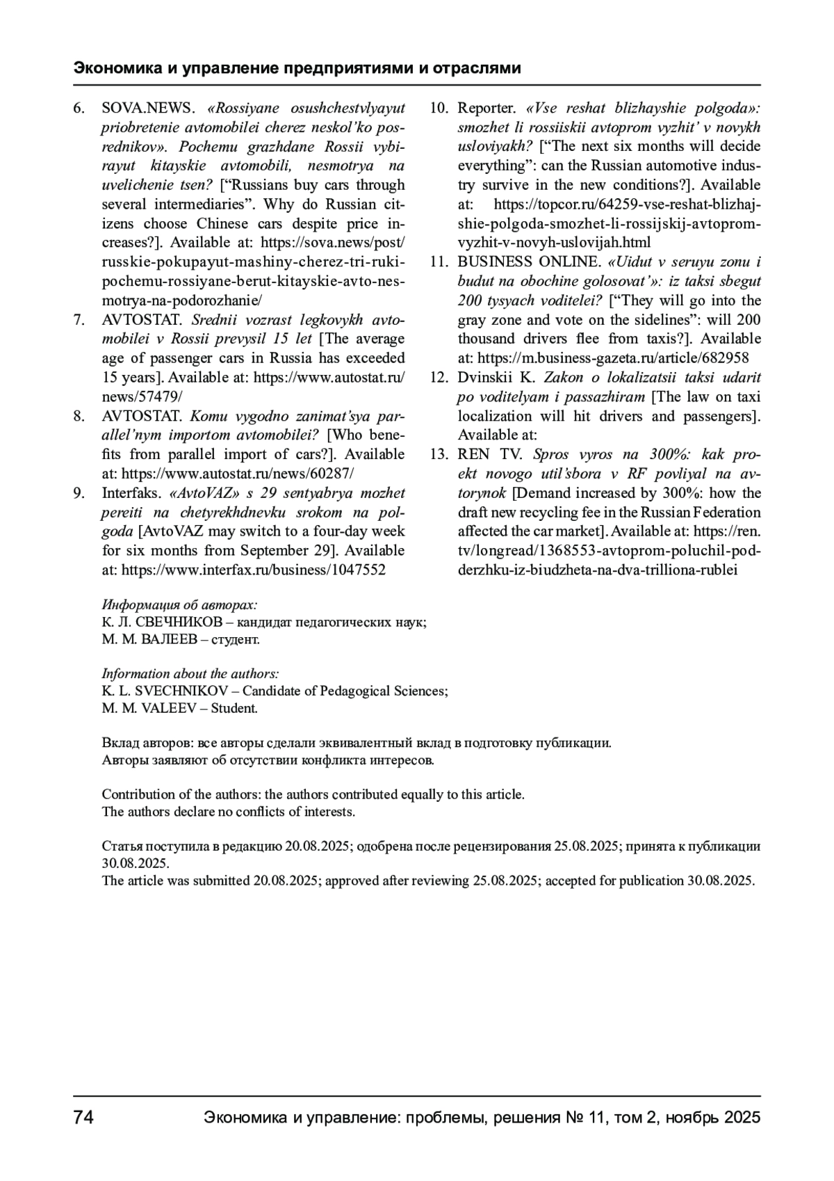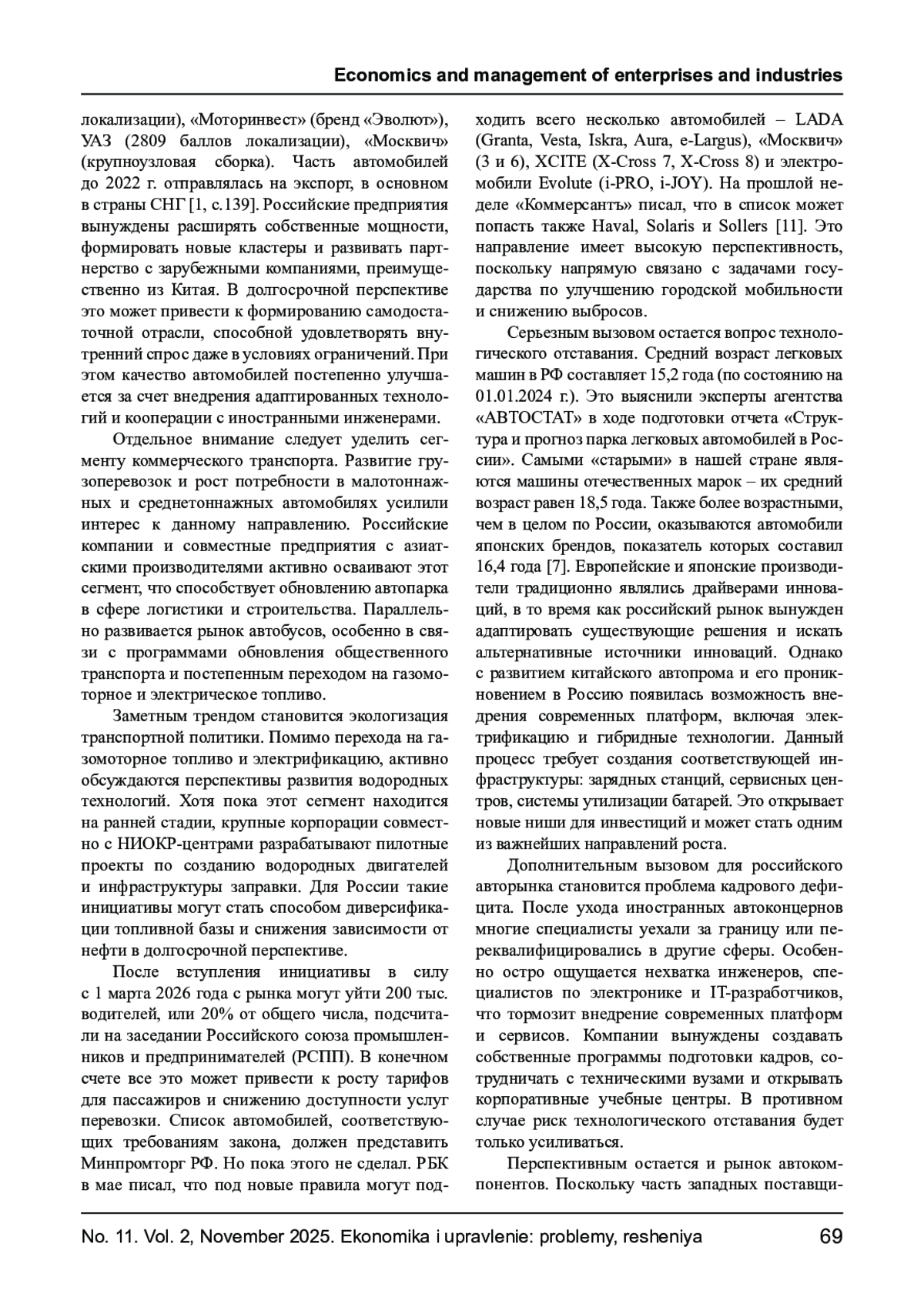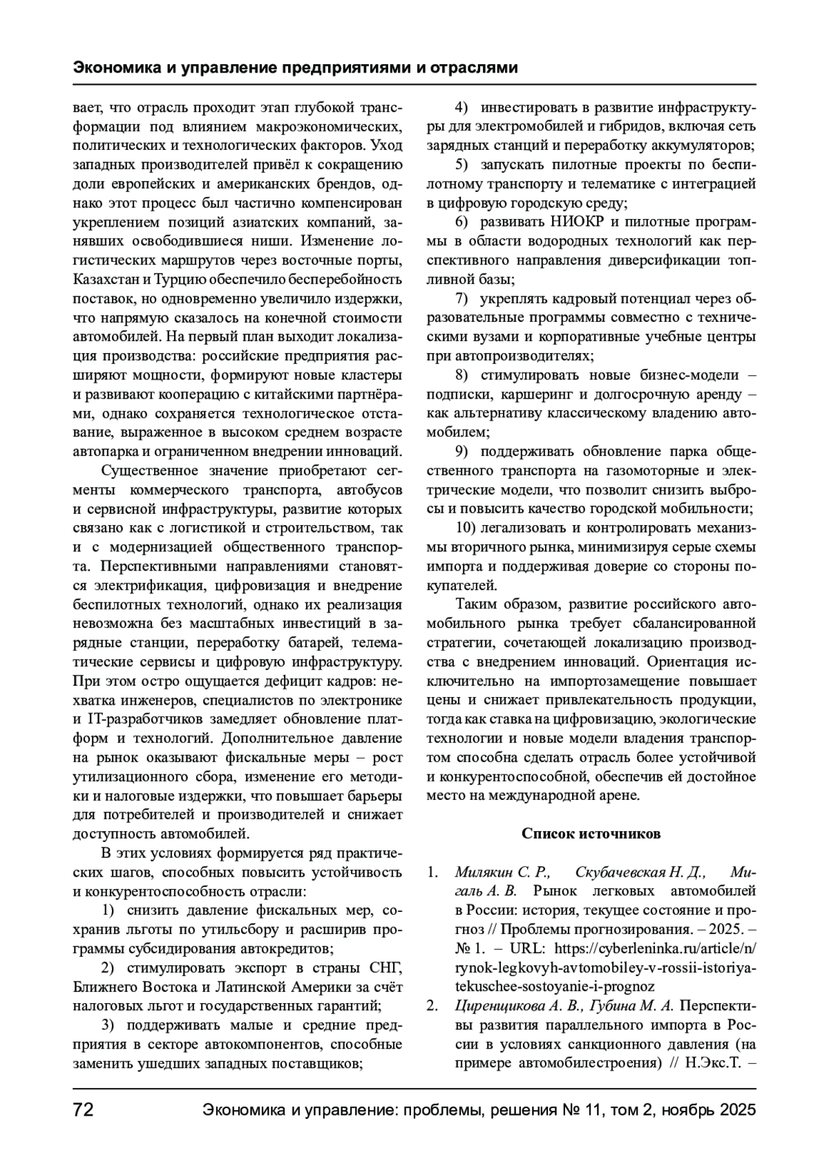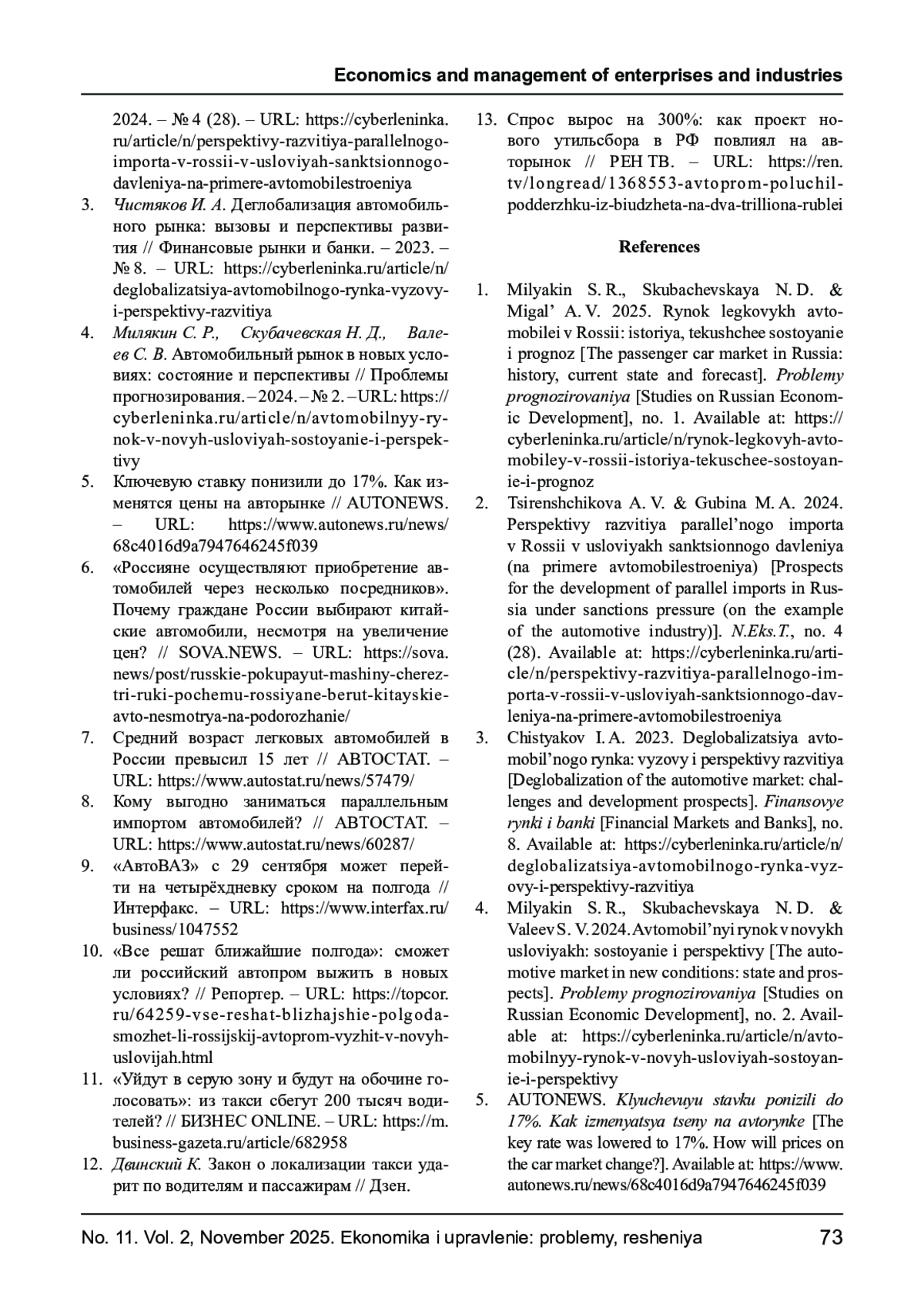 1. Милякин С. Р., Скубачевская Н. Д., Мигаль А. В. Рынок легковых автомобилей в России: история, текущее состояние и прогноз // Проблемы прогнозирования. - 2025. - № 1. - URL: https://cyberleninka.ru/article/n/rynok-legkovyh-avtomobiley-v-rossii-istoriyatekuschee-sostoyanie-i-prognoz.