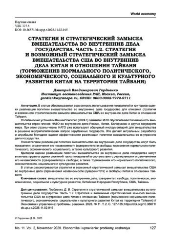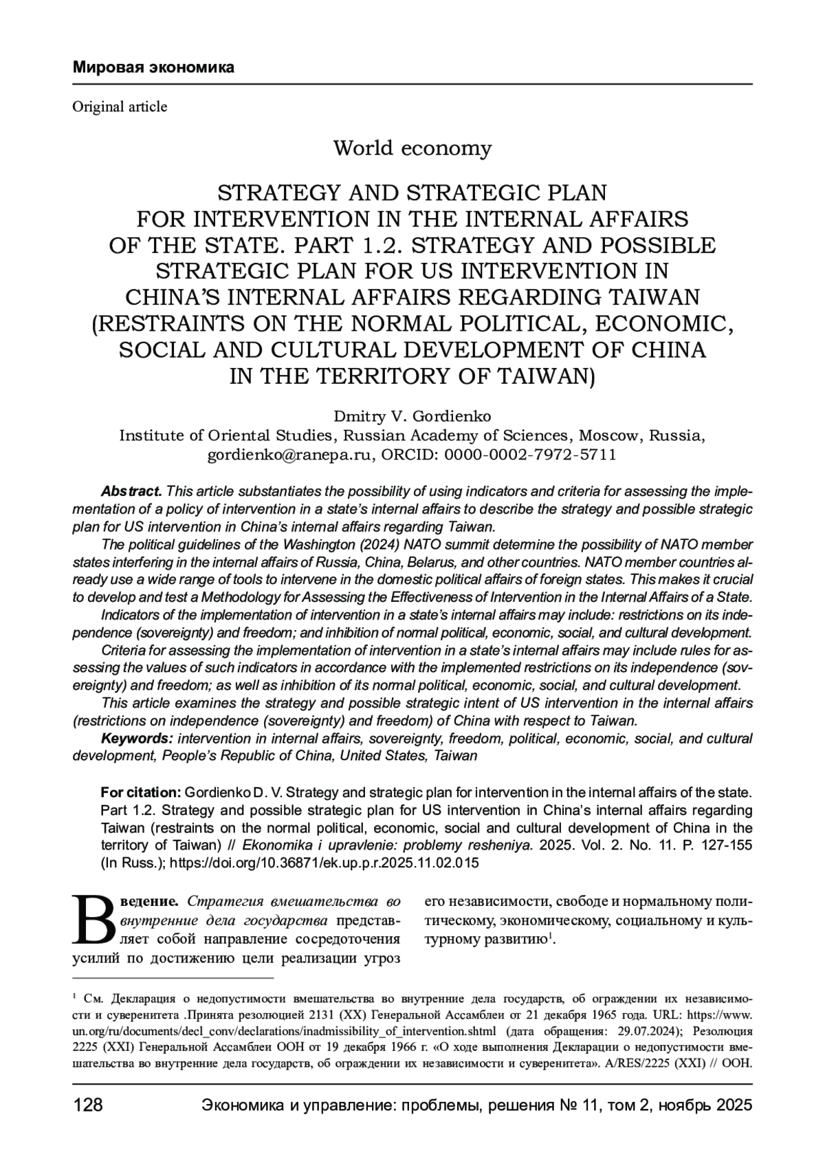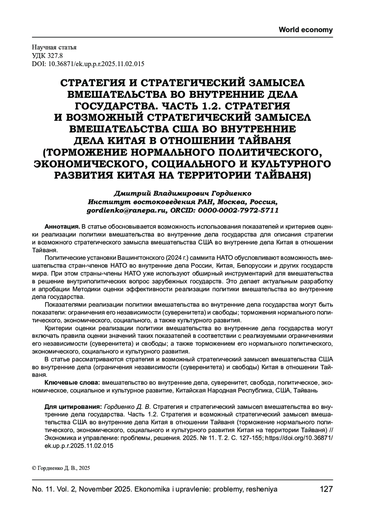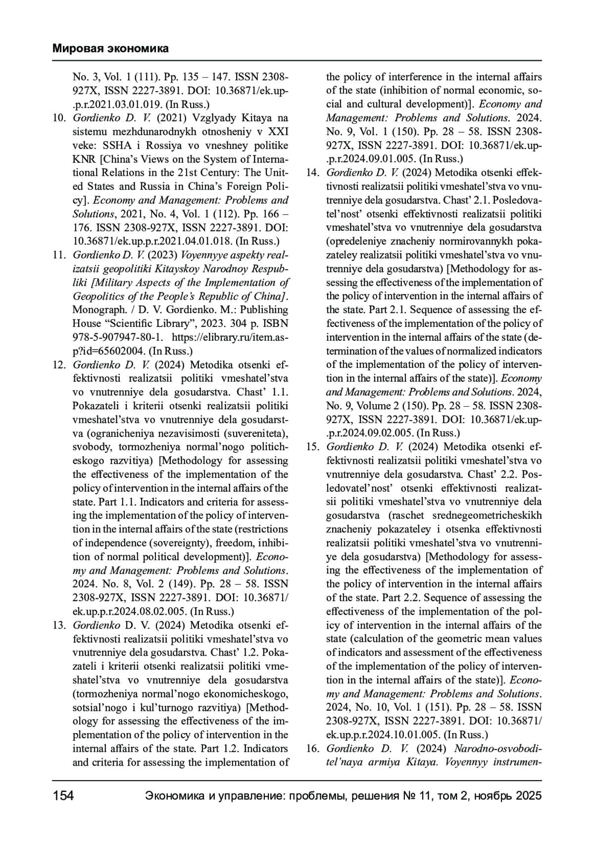 10. Гордиенко Д. В. Методика оценки эффективности реализации политики вмешательства во внутренние дела государства. Часть 3.2. Оценка эффективности реализации политики вмешательства США во внутренние дела Китая в отношении Тайваня (алгоритм оценки эффективности реализации политики вмешательства) // Экономика и управление: проблемы и решения, 2024, № 11, том 1 (152) - С. 28 - 58. ISSN 2308-927X, ISSN 2227-3891. DOI: 10.36871/ek.up.p.r.2024.11.01.005