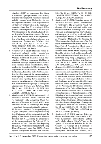12. Гордиенко Д. В. Методика оценки эффективности реализации политики вмешательства во внутренние дела государства. Часть 4.2. Оценка эффективности реализации политики вмешательства США во внутренние дела Китая в отношении Гонконга (замысел (цель) и фактически достигнутые результаты реализации политики Соединенных Штатов в отношении Гонконга (Сянгана)) // Экономика и управление: проблемы и решения, 2024, № 12, том 1 (153) - С. 28 - 58. ISSN 2308- 927X, ISSN 2227-3891. (ВАК). DOI: 10.36871/ek.up.p.r.2024.12.01.005