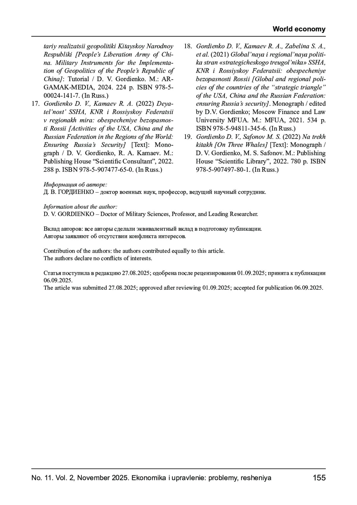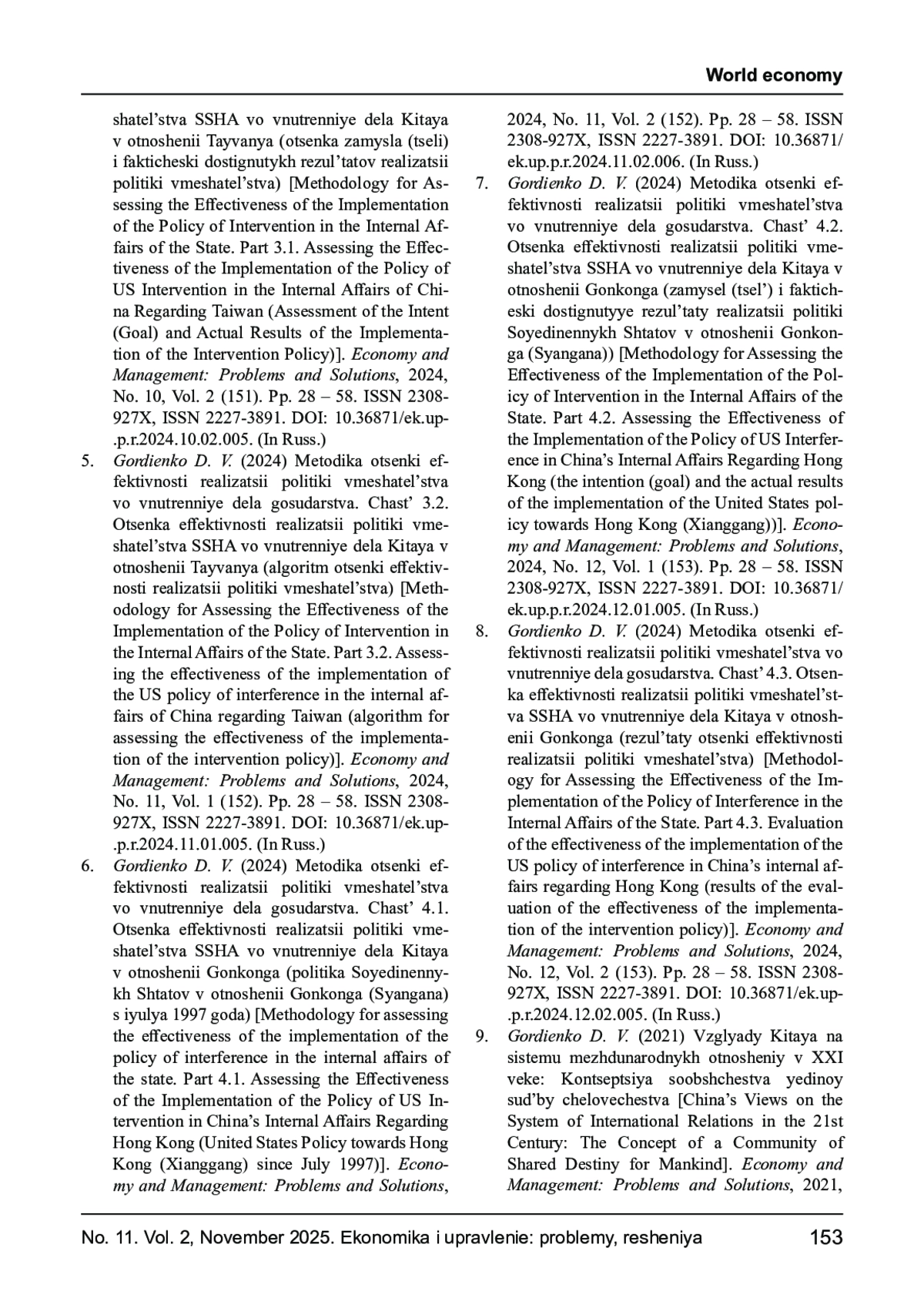 3. Гордиенко Д. В. Влияние американо-китайского противостояния на реализацию национальных интересов России. Часть 1: Антикитайская деятельность США в противостоянии с КНР // Экономика и управление: проблемы и решения, 2021, № 8, том 2 (116) - С. 122 - 138. ISSN 2308-927X, ISSN 22273891. DOI: 10.36871/ek.up.p.r.2021.08.02.015