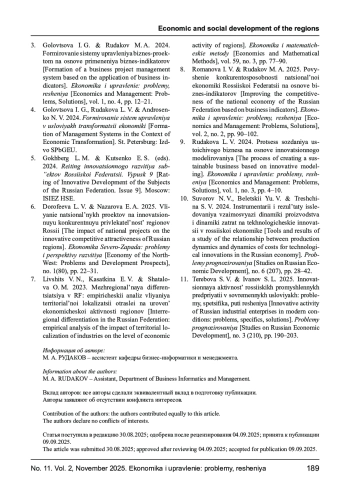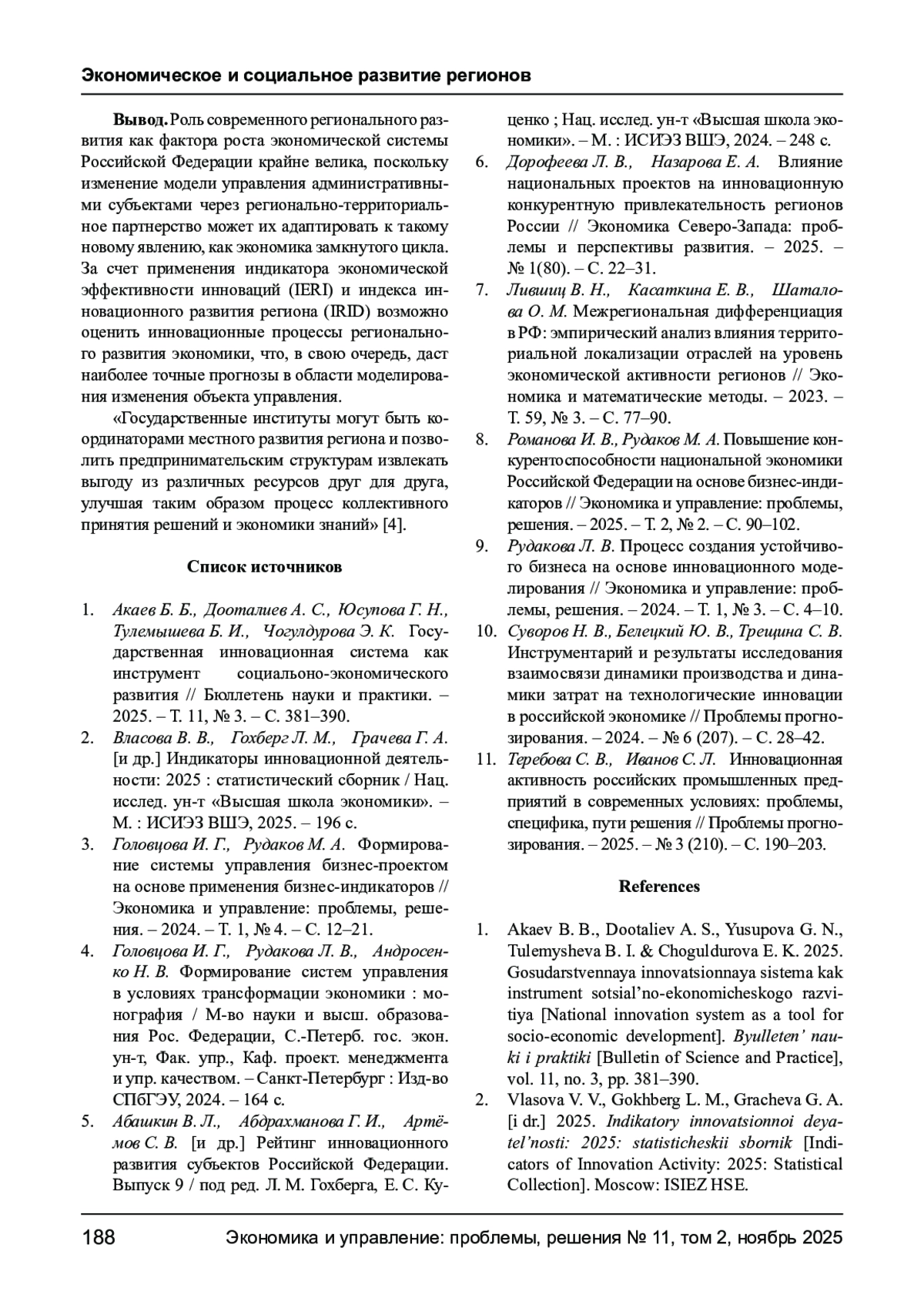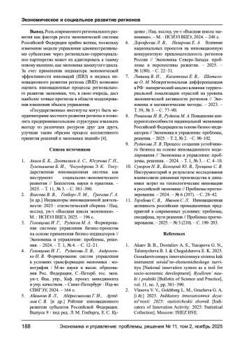 11. Теребова С. В., Иванов С. Л. Инновационная активность российских промышленных предприятий в современных условиях: проблемы, специфика, пути решения // Проблемы прогнозирования. - 2025. - № 3 (210). - С. 190-203.