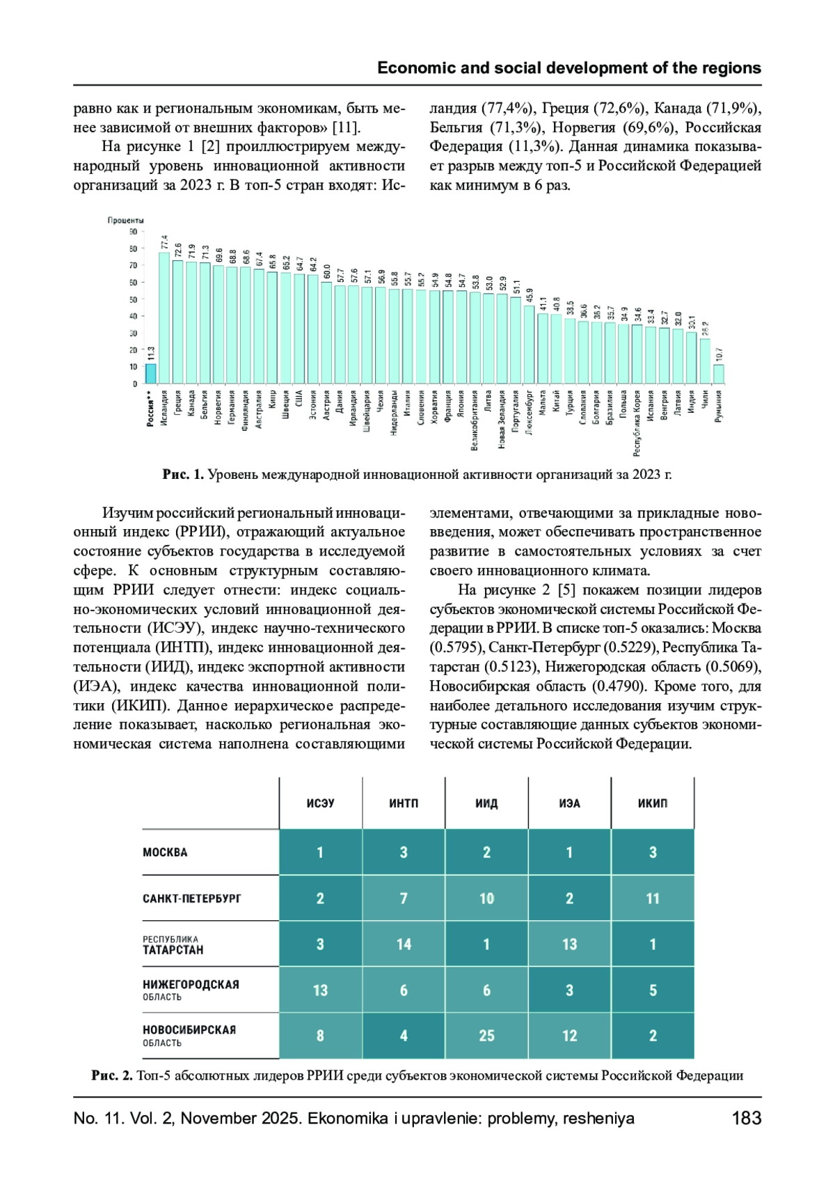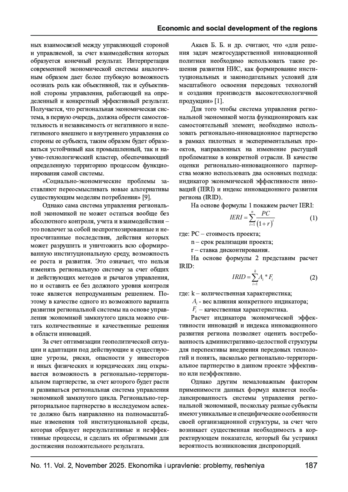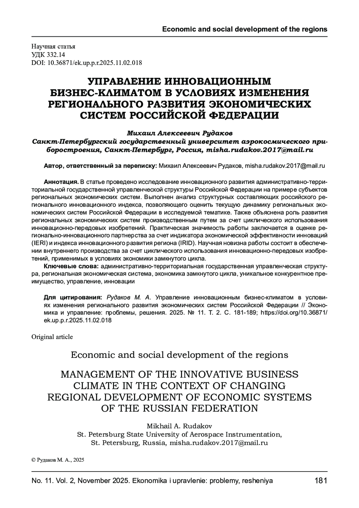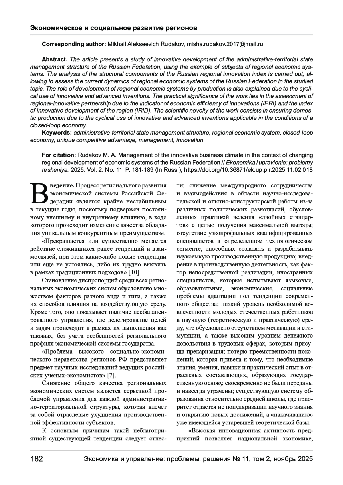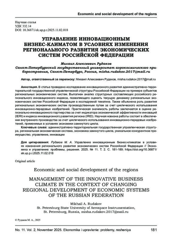 В статье проведено исследование инновационного развития административно-территориальной государственной управленческой структуры Российской Федерации на примере субъектов региональных экономических систем. Выполнен анализ структурных составляющих российского регионального инновационного индекса, позволяющего оценить текущую динамику региональных экономических систем Российской Федерации в исследуемой тематике. Также объяснена роль развития региональных экономических систем производственным путем за счет циклического использования инновационно-передовых изобретений. Практическая значимость работы заключается в оценке регионально-инновационного партнерства за счет индикатора экономической эффективности инноваций (IERI) и индекса инновационного развития региона (IRID). Научная новизна работы состоит в обеспечении внутреннего производства за счет циклического использования инновационно-передовых изобретений, применимых в условиях экономики замкнутого цикла.