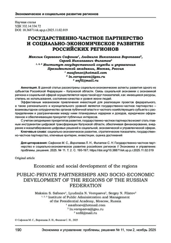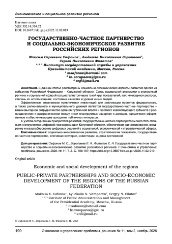 В данной статье рассмотрены социально-экономические аспекты развития одного из субъектов Российской Федерации - Калужской области. Связь социальной экономики с экономикой региона и социальной сферой осуществляется через такой круг показателей, как: имеющиеся ресурсы, степень их использования, состояние качества и уровня жизни людей. Эффективным механизмом привлечения инвестиций для реализации проектов федерального, а также регионального и муниципального уровней является государственно-частное партнерство - взаимовыгодное сотрудничество органов публичной власти и частного хозяйствующего субъекта с распределением и разграничением между ними планируемых издержек и доходов, юридически оформленное и обеспечивающее приоритет публичных интересов. С учетом сегодняшних приоритетов развития, государственно-частное партнерство может стать главным инструментом цифровой трансформации Калужской области, обеспечивая финансирование, внедрение и масштабирование цифровых решений в социальной, экономической и управленческой сферах.