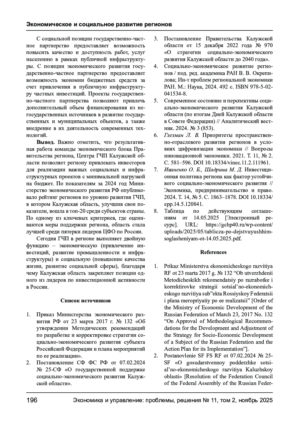 7. Иваненко О. Б., Шадрина М. Д. Инвестиционная политика региона как фактор устойчивого социально-экономического развития // Экономика, предпринимательство и право. 2024. Т. 14, № 5. С. 1863-1878. DOI: 10.18334/epp.14.5.120841 EDN: BTPQTR