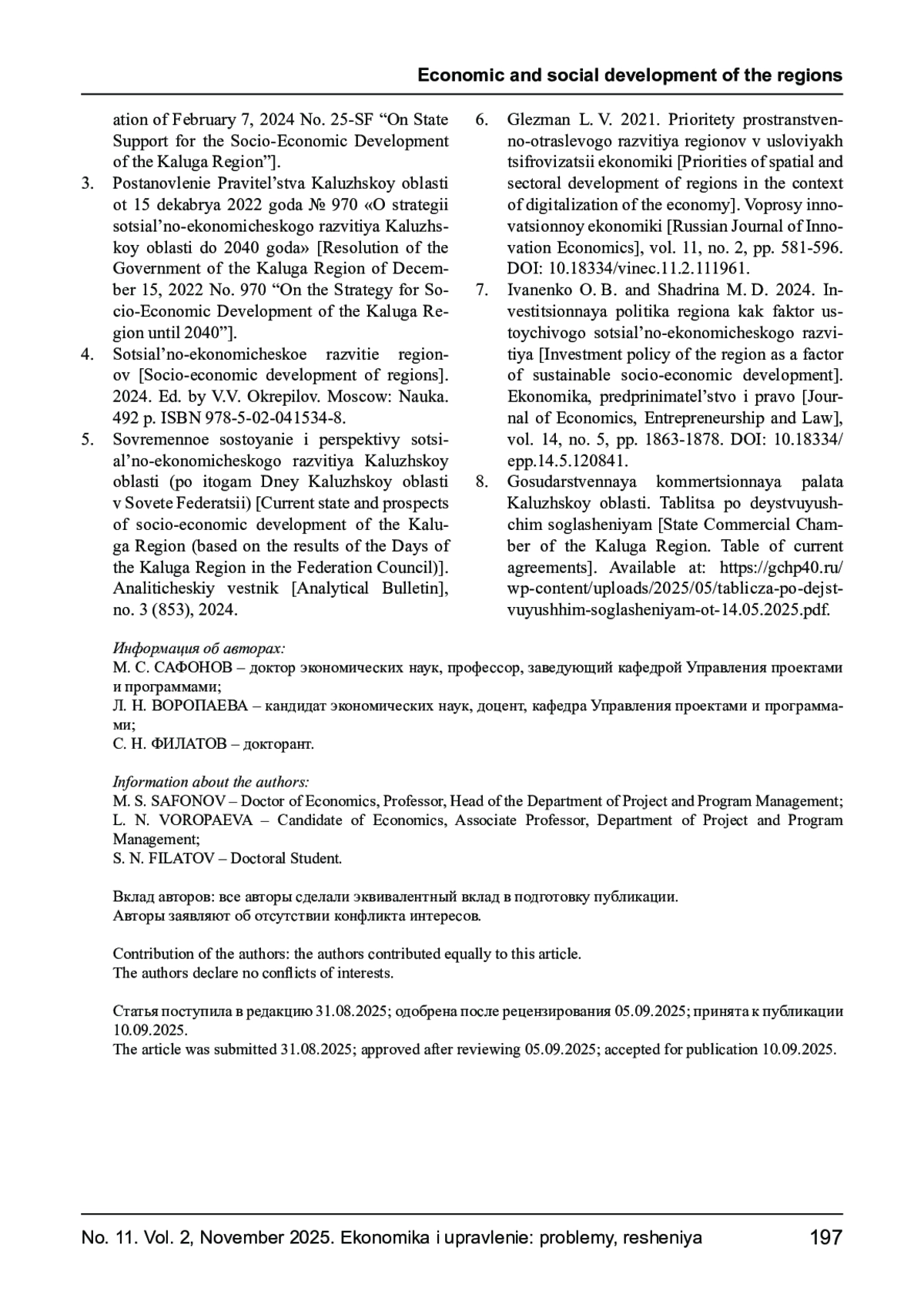 6. Глезман Л. В. Приоритеты пространственно-отраслевого развития регионов в условиях цифровизации экономики // Вопросы инновационной экономики. 2021. Т. 11, № 2. С. 581-596. DOI: 10.18334/vinec.11.2.111961 EDN: WRQJAW