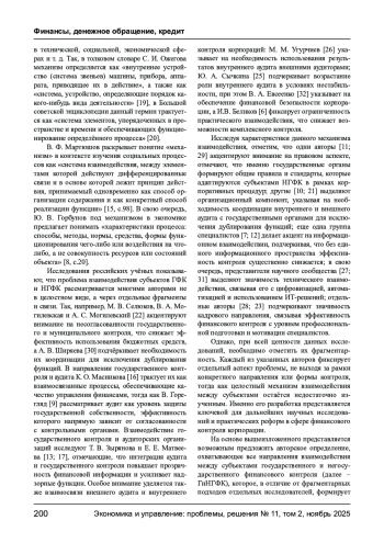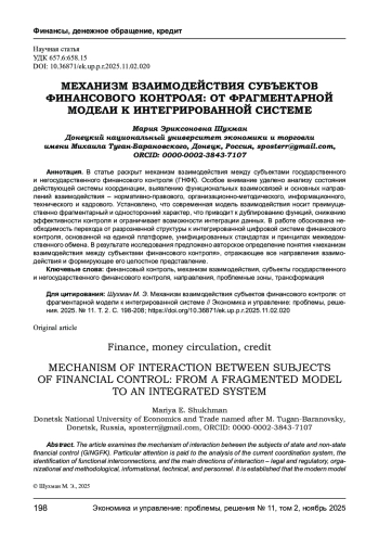В статье раскрыт механизм взаимодействия между субъектами государственного и негосударственного финансового контроля (ГНФК). Особое внимание уделено анализу состояния действующей системы координации, выявлению функциональных взаимосвязей и основных направлений взаимодействия - нормативно-правового, организационно-методического, информационного, технического и кадрового. Установлено, что современная модель взаимодействия носит преимущественно фрагментарный и односторонний характер, что приводит к дублированию функций, снижению эффективности контроля и ограничивает возможности интеграции данных. В работе обоснована необходимость перехода от разрозненной структуры к интегрированной цифровой системе финансового контроля, основанной на единой платформе, унифицированных стандартах и принципах межведомственного обмена. В результате исследования предложено авторское определение понятия «механизм взаимодействия между субъектами финансового контроля», отражающее все направления взаимодействия и формирующее его целостное представление.