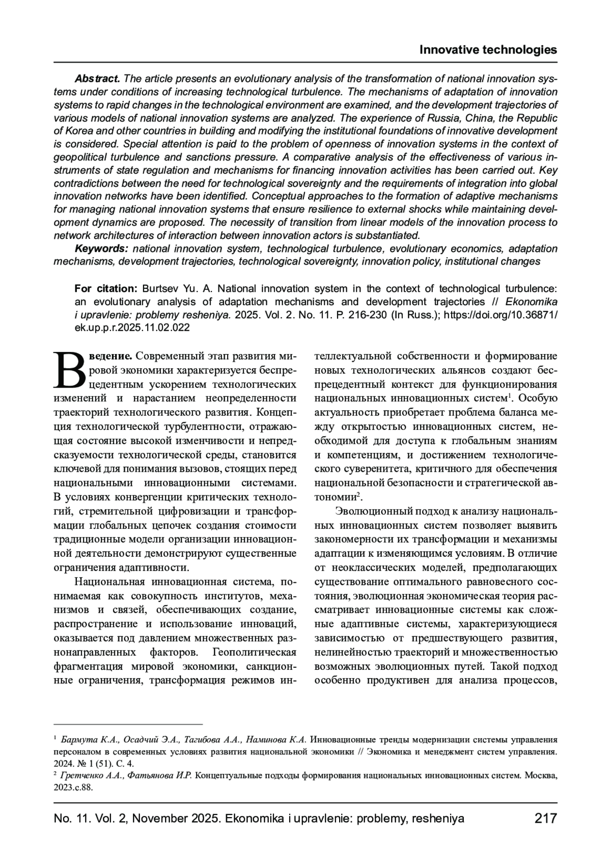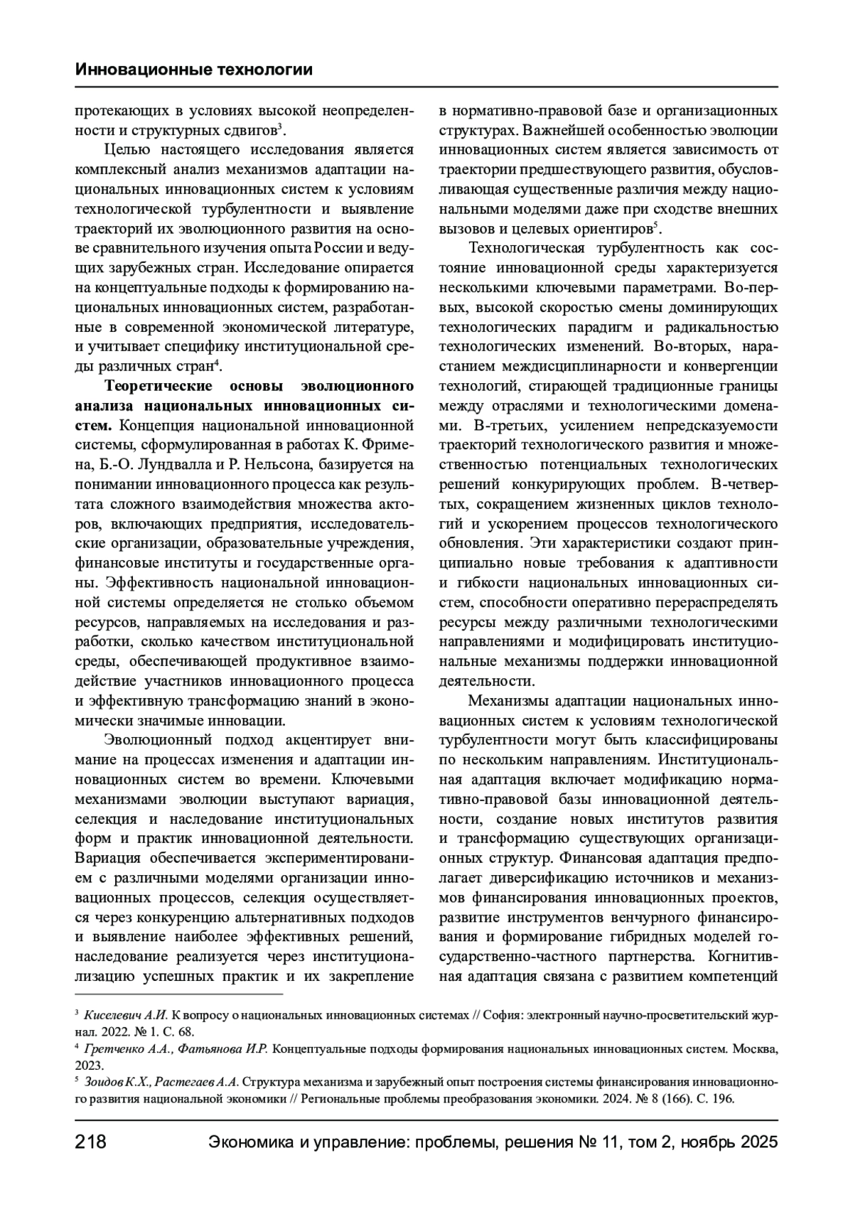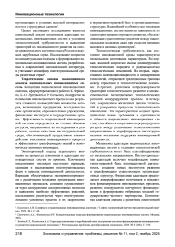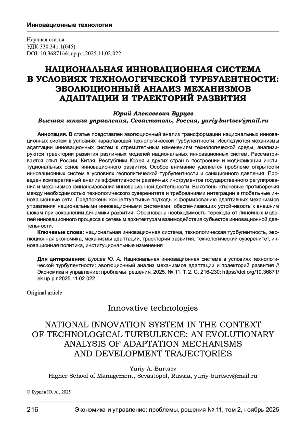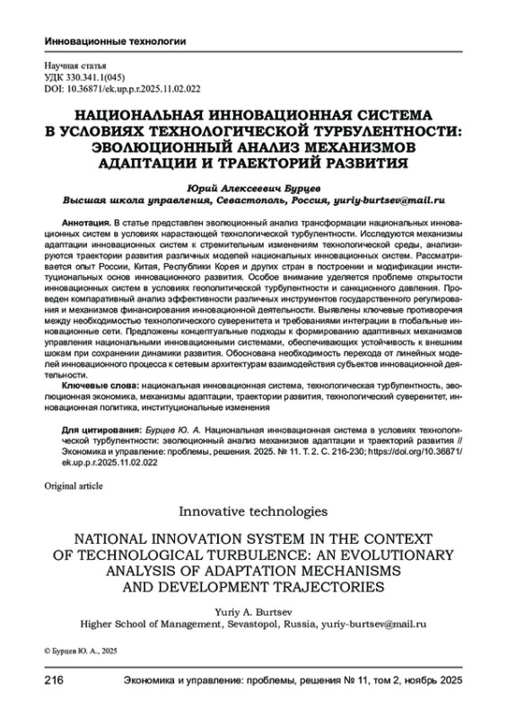 В статье представлен эволюционный анализ трансформации национальных инновационных систем в условиях нарастающей технологической турбулентности. Исследуются механизмы адаптации инновационных систем к стремительным изменениям технологической среды, анализируются траектории развития различных моделей национальных инновационных систем. Рассматривается опыт России, Китая, Республики Корея и других стран в построении и модификации институциональных основ инновационного развития. Особое внимание уделяется проблеме открытости инновационных систем в условиях геополитической турбулентности и санкционного давления. Проведен компаративный анализ эффективности различных инструментов государственного регулирования и механизмов финансирования инновационной деятельности. Выявлены ключевые противоречия между необходимостью технологического суверенитета и требованиями интеграции в глобальные инновационные сети. Предложены концептуальные подходы к формированию адаптивных механизмов управления национальными инновационными системами, обеспечивающих устойчивость к внешним шокам при сохранении динамики развития. Обоснована необходимость перехода от линейных моделей инновационного процесса к сетевым архитектурам взаимодействия субъектов инновационной деятельности.