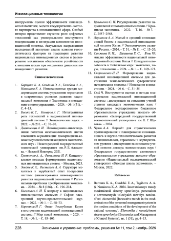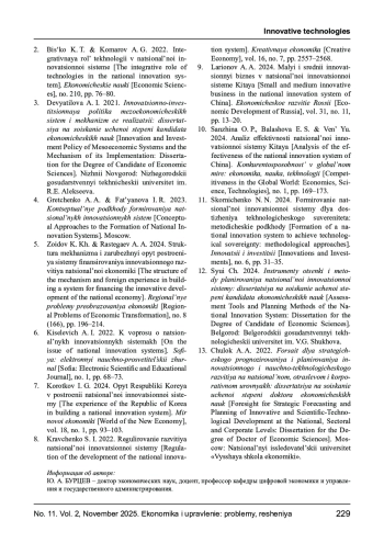 4. Гретченко А. А., Фатьянова И. Р. Концептуальные подходы формирования национальных инновационных систем. - Москва, 2023. EDN: WMKSZT