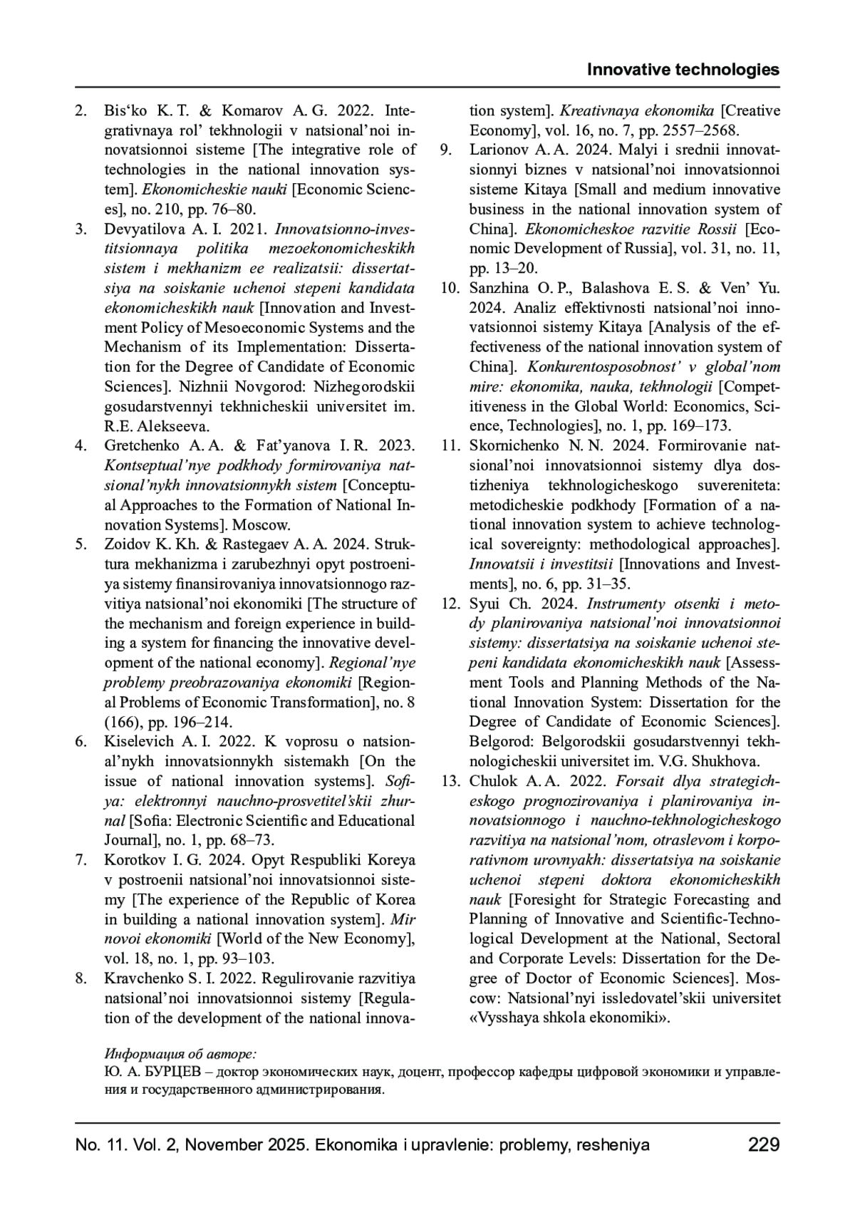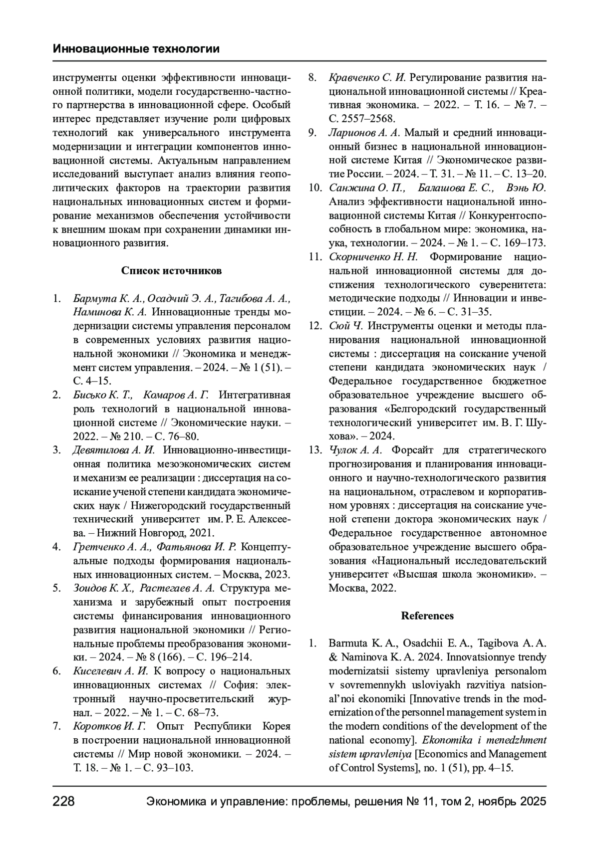 11. Скорниченко Н. Н. Формирование национальной инновационной системы для достижения технологического суверенитета: методические подходы // Инновации и инвестиции. - 2024. - № 6. - С. 31-35. EDN: LTPXWY