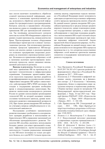 Современные процессы производства в Российской Федерации в последние несколько лет получили необходимость соблюдения технологического, логистического и экономического суверенитета в рамках нестабильной геополитической обстановки. Также процессы производства в различных сферах промышленности имеют возможности по повышению производительности предприятий с помощью применения алгоритмов искусственных нейронных сетей. Данная работа рассматривает потенциал улучшения показателей производительности предприятий на территории России посредством внедрения алгоритмов искусственных нейронных сетей в процессы производства. Актуальность исследования обусловлена необходимостью адаптации предприятий к быстро меняющимся внешним условиям и требованиям импортозамещения. Анализ существующих технологий и их влияние на развитие промышленности представляют большой интерес для разработки стратегий национальной безопасности и повышения конкурентоспособности российских предприятий. Целью исследования является оценка потенциала и практических возможностей использования инструментов искусственного интеллекта для повышения эффективности управления предприятиями-производителями компонентов.