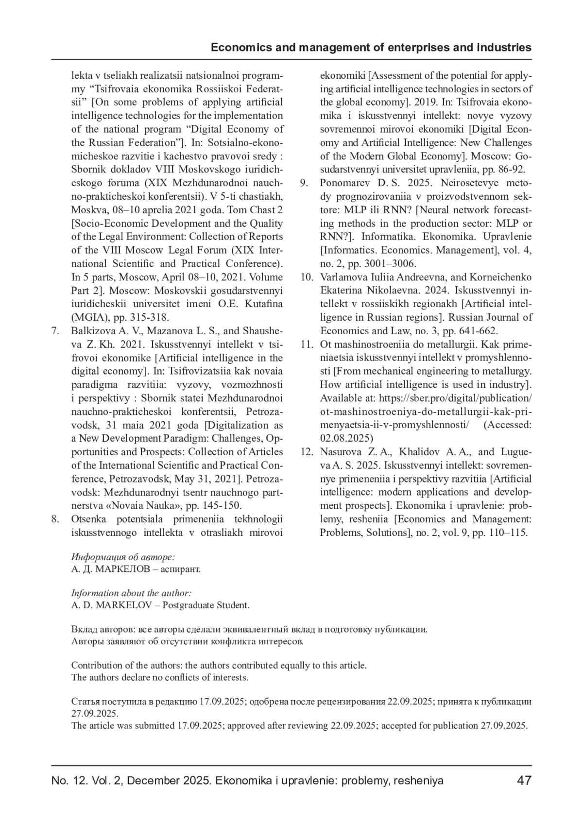 12. Насурова З. А. Халидов А. А. Лугуева А. С. Искусственный интеллект: современные приме нения и перспективы развития // Экономика и управление: проблемы, решения. - 2025. - № 2. - Т. 9. - С. 110-115.
