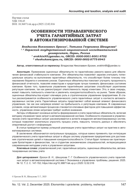 Применение оценочных обязательств по гарантийному ремонту важно для обеспечения финансовой стабильности компании. Эти обязательства позволяют заранее учитывать потенциальные затраты на выполнение гарантийных обязательств, что способствует более точному планированию бюджета и снижению рисков. Оценочные обязательства помогают улучшить прозрачность финансовой отчетности, позволяя инвесторам и кредиторам лучше понимать финансовое состояние компании. Кроме того, правильное управление гарантийными затратами способствует укреплению репутации компании, так как демонстрирует ответственность перед клиентами. Это, в свою очередь, может повысить лояльность клиентов и увеличить конкурентоспособность на рынке. Таким образом, оценочные обязательства играют ключевую роль в стратегическом управлении предприятием. В статье рассматриваются особенности управленческого учета гарантийных затрат в контексте автоматизированных систем учета. Гарантийные затраты представляют собой важный элемент финансового управления, так как они напрямую влияют на прибыльность и репутацию компании. В современных условиях, когда автоматизация процессов становится ключевым фактором для повышения эффективности, управление этими затратами требует особого внимания. Авторы отображают основные аспекты формирования и учета гарантийных обязательств, включая методику отражения таких затрат в автоматизированной системе. Особенности отражения в управленческом учете гарантийных затрат рассматривается в аспекте внедрения автоматизированных систем, которые позволяют значительно упростить процесс учета, повысить точность данных и обеспечить оперативный доступ к информации. В статье приводится пример успешной реализации учета гарантийных затрат на практике в автоматизированных системах. В заключение обозначаются контрольные процедуры, которые важно применять при интеграции управленческого учета гарантийных затрат в общую систему управления предприятием для достижения стратегических целей и повышения конкурентоспособности. Статья будет полезна как практикующим бухгалтерам и финансистам, так и студентам экономических специальностей, интересующимся современными методами учета и управления затратами.