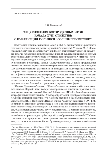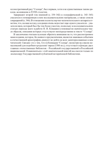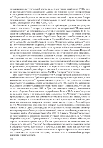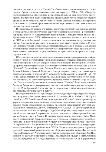 Двухтомное издание, вышедшее в свет в 2021 г., осуществлено в результате реализации совместного проекта Научной библиотеки МГУ имени М. В. Ломоносова и столичного издательства “Пан Пресс”, специализирующегося на выпуске дорогих подарочных и эксклюзивных книг. В публикации приведен полный текст уникального исторического источника первой четверти XVIII века – своеобразной энциклопедии богородичных икон, которую ее составитель по одному из эпитетов Богородицы назвал “Солнце Пресветлое”, а также представлены разноаспектные исследовательские материалы об этом памятнике, сопровожденные вспомогательными указателями и насыщенным иллюстративным рядом. В первом томе содержится факсимильное воспроизведение рукописи. Том идентичен по формату оригиналу (в четверку), а его переплет внешне повторяет оформление переплета памятника. Научная публикация текста источника, указатели, иллюстрации и исследовательские материалы помещены во втором томе, имеющем значительно больший по сравнению с первым томом формат.