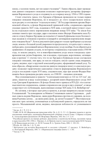 Из-за крайне неполной сохранности документов XVI века датировка и обстоятельства проведения основной части писцовых описаний этого периода восстанавливаются лишь по упоминаниям в отдельных актах, многие из которых по сей день не обнаружены. Публикуемая грамота представляет большую ценность, так как это единственный из найденных к настоящему времени документов, где упоминается несохранившаяся писцовая книга Воронежского уезда 1598/99 года Бориса Хрущова и Семена Ефимьева и цитируется ее фрагмент. Факт проведения этой переписи пока не введен в научный оборот, в работах наиболее авторитетных специалистов по ранней истории Воронежа: В. Н. Глазьева, В. П. и П. В. Загоровских, Е. В. Камараули, М. Ю. Зенченко и других – ссылок на это писцовое описание не приводится. Вопрос о времени формирования Воронежского уезда до сих пор остается не вполне разрешенным. К настоящему моменту выдвигалось две наиболее основательных версии о моменте возникновения уезда. Первую отстаивал В. Н. Глазьев, утверждая, что уезд создан в правление Бориса Годунова в период между 1598 и 1605 годами1. Вторую – М. Ю. Зенченко в своей кандидатской диссертации2, а позже и в монографии “Южное Российское порубежье”. Исследователь выдвигал версию о том, что уезд создан уже после Смуты, а владения закреплены лишь в 1615 году3.