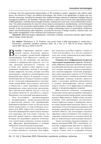 В статье рассмотрены эволюция и современное состояние BIM-технологии в строительной отрасли в контексте цифровой трансформации экономики. Проанализированы этапы становления BIM в России, от экспериментального внедрения 3D-моделирования до системной интеграции с искусственным интеллектом, Интернетом вещей и аддитивными технологиями. Определены ключевые тенденции цифровизации проектно-строительных процессов, переход от традиционных методов проектирования к комплексным интеллектуальным платформам управления жизненным циклом объектов. Особое внимание уделено экономическому и организационному эффекту применения BIM, сокращению сроков проектирования, снижению ошибок и себестоимости работ, росту производительности труда. Подчеркнута необходимость развития кадрового потенциала, стандартизации и технологического суверенитета для успешной реализации стратегии цифровой модернизации строительного комплекса России. Резюмируется формирование методологии проектирования, основанной на системности, интеллектуализации и междисциплинарной интеграции данных, обеспечивающих точность проектных решений, сокращение издержек и качественный уровень управляемости инвестиционно-строительным процессом.