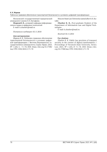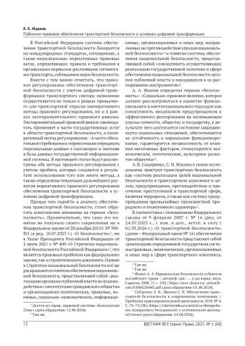 2. Сидоренко А. В., Махина С. Н. Обеспечение транспортной безопасности в современном понимании // Проблемы правоохранительной деятельности. 2018. № 4. С. 70-73. URL: https://cyberleninka.ru/article/n/obespechenie-transportnoy-bezopas nosti-v-sovremennom-ponimanii/viewer. EDN: YRORFZ
