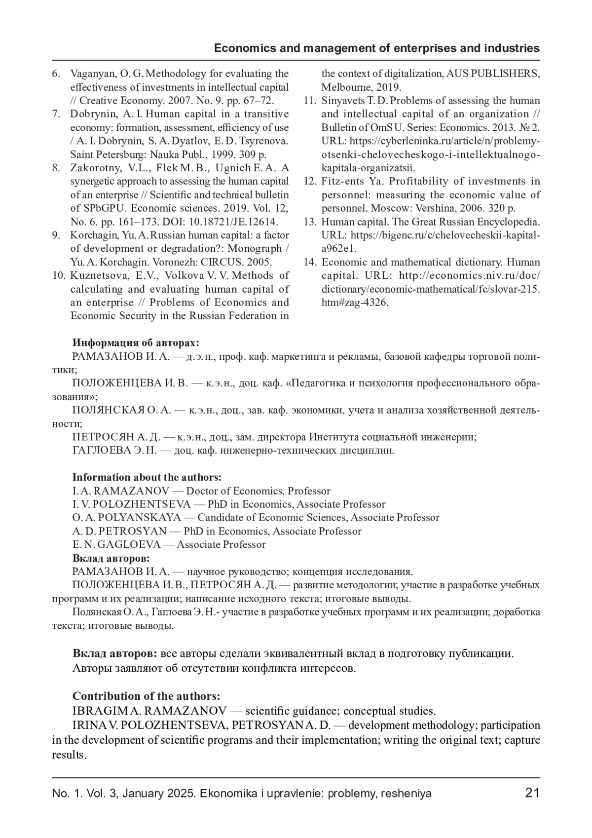 10. Кузнецова, Е.В., Волкова В. В. Методы расчета и оценки человеческого капитала предприятия // Проблемы экономики и экономической безопасности в Российской Федерации в условиях цифровизации, Издательство AUS PUBLISHERS, Мельбурн, 2019. EDN: BECRWC