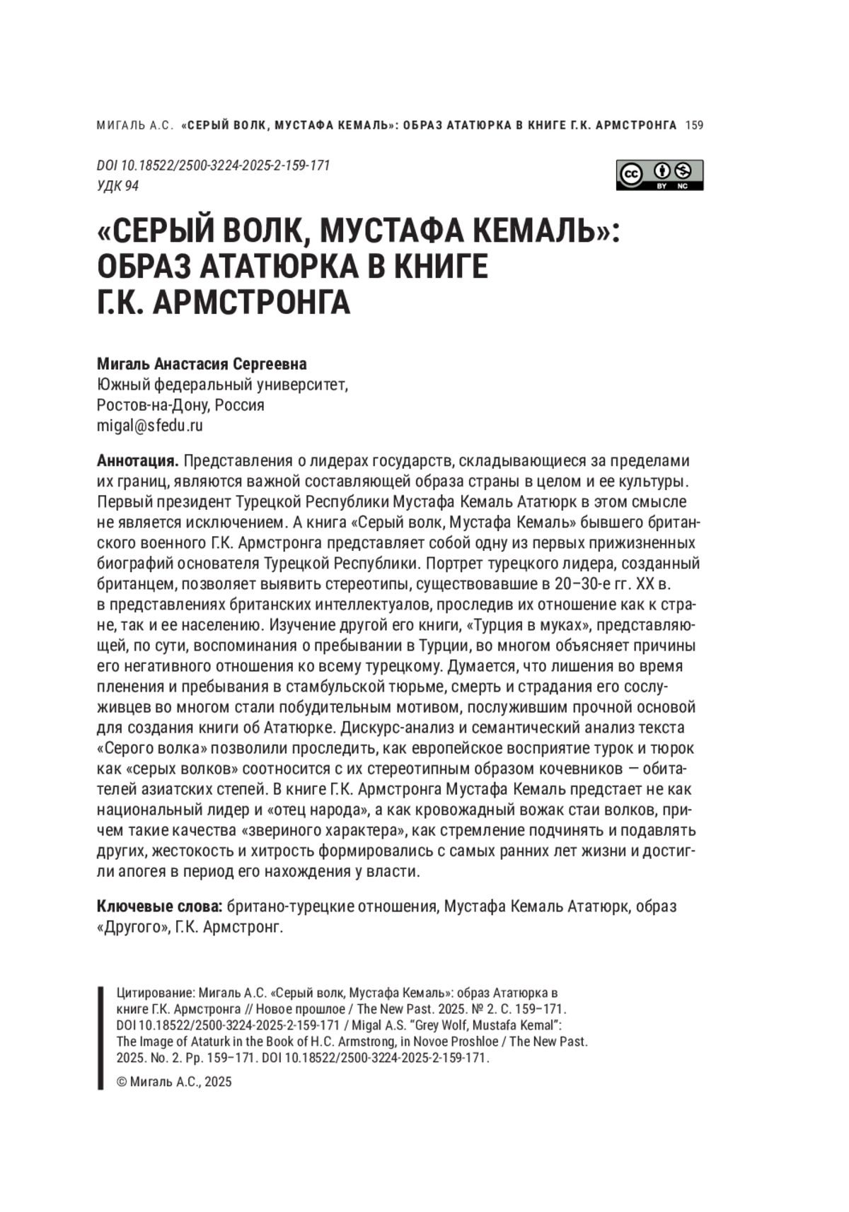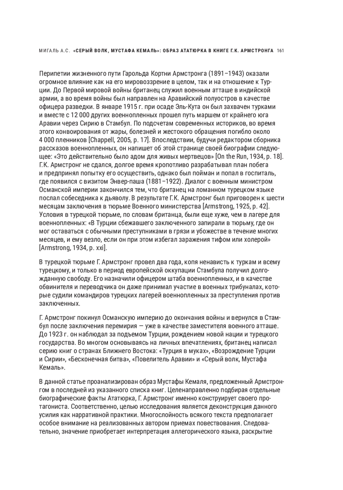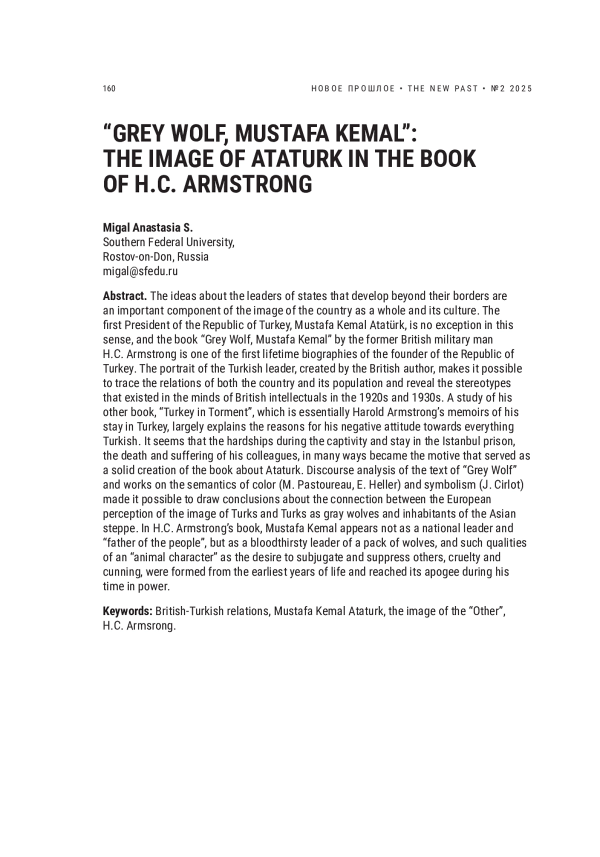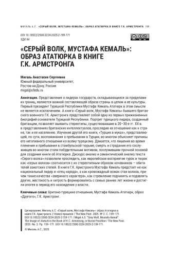 Представления о лидерах государств, складывающиеся за пределами их границ, являются важной составляющей образа страны в целом и ее культуры. Первый президент Турецкой Республики Мустафа Кемаль Ататюрк в этом смысле не является исключением. А книга «Серый волк, Мустафа Кемаль» бывшего британского военного Г. К. Армстронга представляет собой одну из первых прижизненных биографий основателя Турецкой Республики. Портрет турецкого лидера, созданный британцем, позволяет выявить стереотипы, существовавшие в 20–30-е гг. XX в. в представлениях британских интеллектуалов, проследив их отношение как к стране, так и ее населению. Изучение другой его книги, «Турция в муках», представляющей, по сути, воспоминания о пребывании в Турции, во многом объясняет причины его негативного отношения ко всему турецкому. Думается, что лишения во время пленения и пребывания в стамбульской тюрьме, смерть и страдания его сослуживцев во многом стали побудительным мотивом, послужившим прочной основой для создания книги об Ататюрке. Дискурс-анализ и семантический анализ текста «Серого волка» позволили проследить, как европейское восприятие турок и тюрок как «серых волков» соотносится с их стереотипным образом кочевников — обитателей азиатских степей. В книге Г. К. Армстронга Мустафа Кемаль предстает не как национальный лидер и «отец народа», а как кровожадный вожак стаи волков, причем такие качества «звериного характера», как стремление подчинять и подавлять других, жестокость и хитрость формировались с самых ранних лет жизни и достигли апогея в период его нахождения у власти