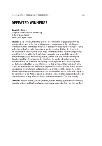 Ключевые фразы: политическая культура, культуры поражения, КУЛЬТУРНАЯ ПАМЯТЬ, коммуникативная память, мемориальные проекты, политическая мобилизация, демократия, всеобщая воинская повинность, пацифизм